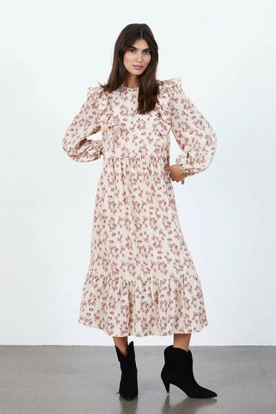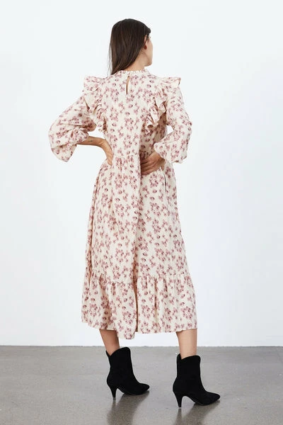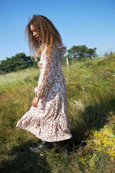 This beautiful style is a proof of that it is the little details that makes the difference. This style is a long dress designed in a loose fit with cute frills at front, back, bottom and neckline. It has 3/4 sleeve with elastic at wrists and a button-closure at the back of the neck. It can be worn day and night, as the dress is easy to dress up or down. In both sides of the dress there are cute pockets, which gives the dress a more casual vibe. Crafted in an amazing print; pink flowers on a cream white base. Quality: 100% Polyester / Lining: 100% Polyester