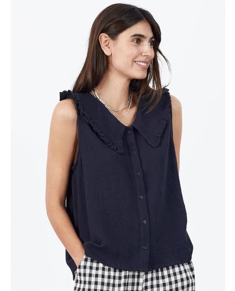 Lollys Laundry Carly Black Top, a textured cotton gauze blouse with a frilly oversized collar and buttons running down the front. Slightly lighter than pure black the Carly blouse is elegant and classic with a loose straight fit. Sleeveless Oversized collar Buttons down the front Textured cotton 100% Cotton Machine wash at 30 MEASUREMENTS: XS: Chest 94 cm / Front length 58 cm / Back length 60 cm S: Chest 98 cm / Front length 59 cm / Back length 61 cm M: Chest 102 cm / Front length 60 cm / Back length 62 cm L: Chest 106 cm / Front length 61 cm / Back length 63 cm