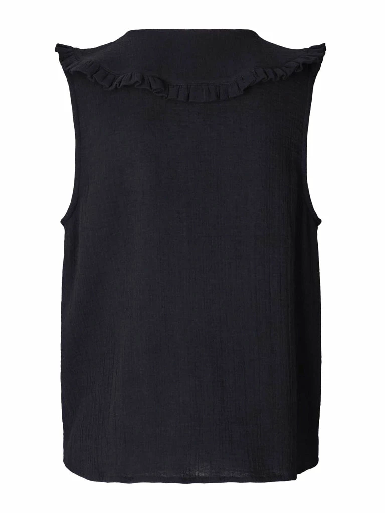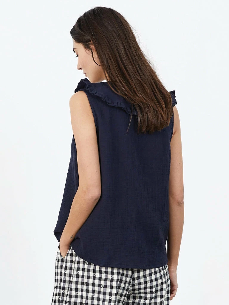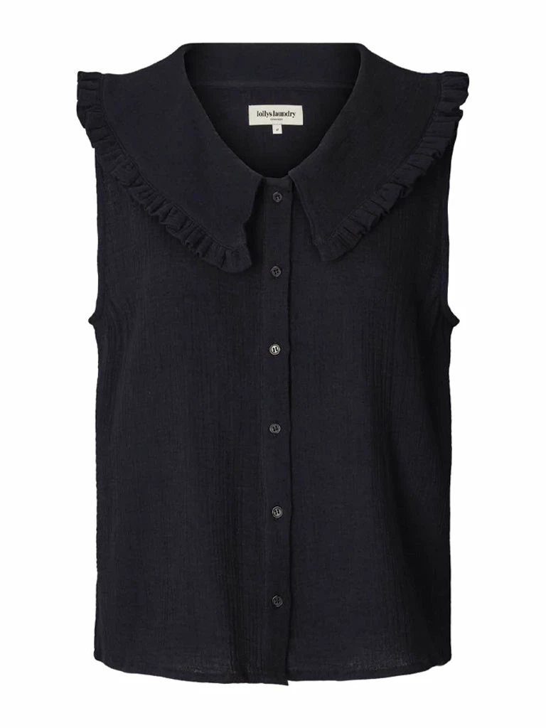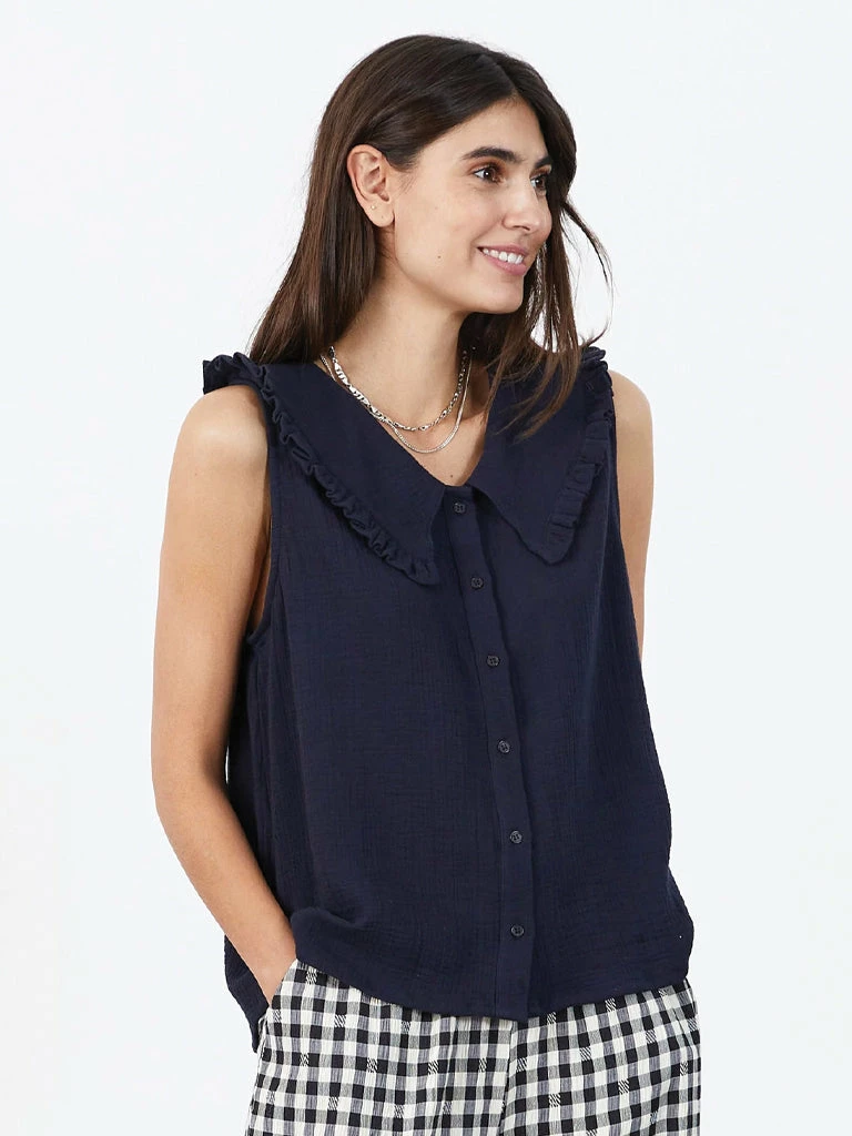 The Carly Blouse from Lolly’s Laundry is an elegant sleeveless blouse featuring a wide ruffled collar. Crafted from 100% cotton, the top is cut in a classic design and finished with a front button placket. 100% Cotton Wide, ruffled collar Slightly textured material Centre front button placket