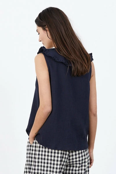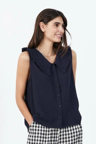 Crafted in a rich quality and a classic design, we adore this elegant piece. The top is sleeveless with a v-neck and front placket with buttons. It has a regular and flattering fit. We love the beautiful big collar, making it something special. Quality: 100% Cotton