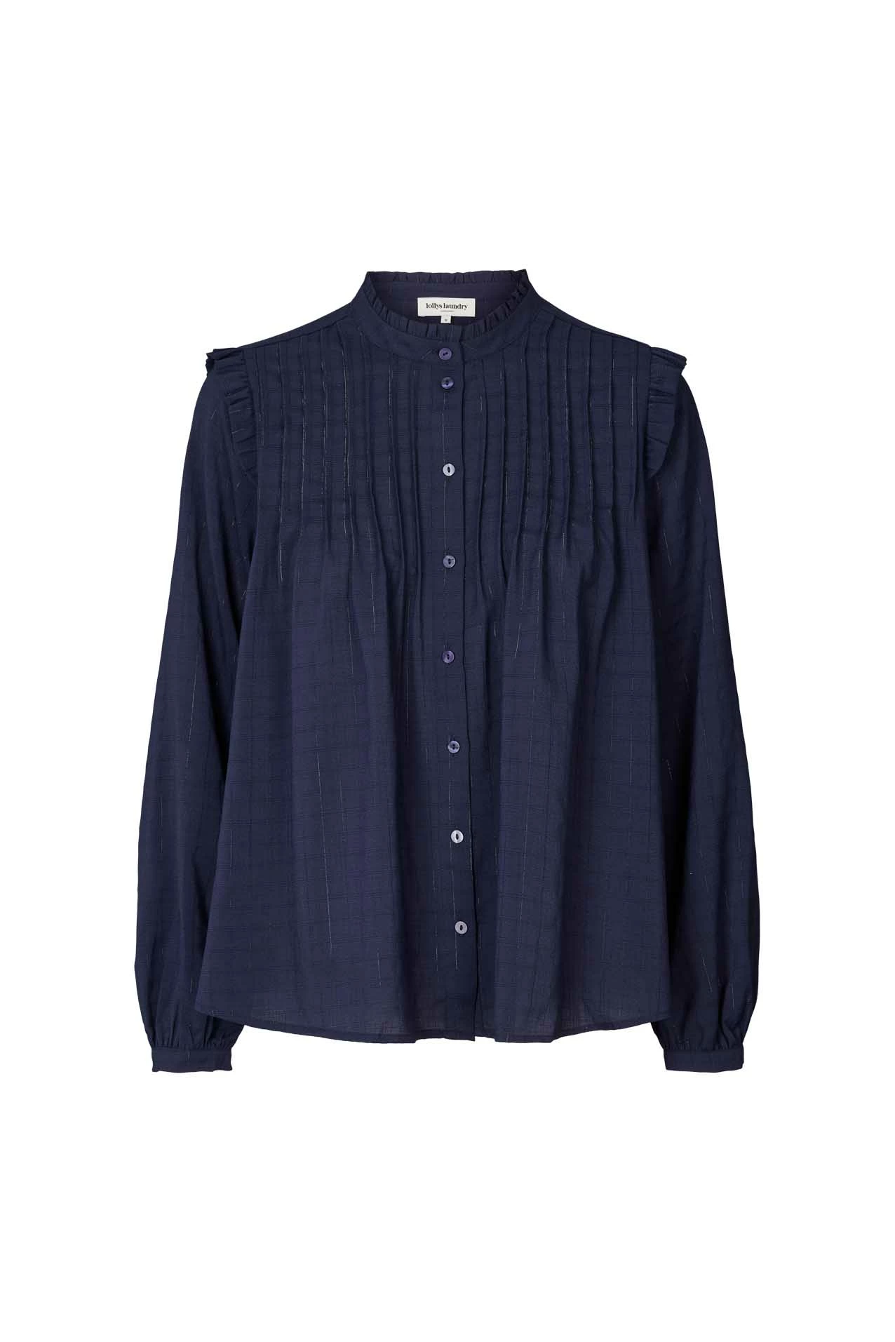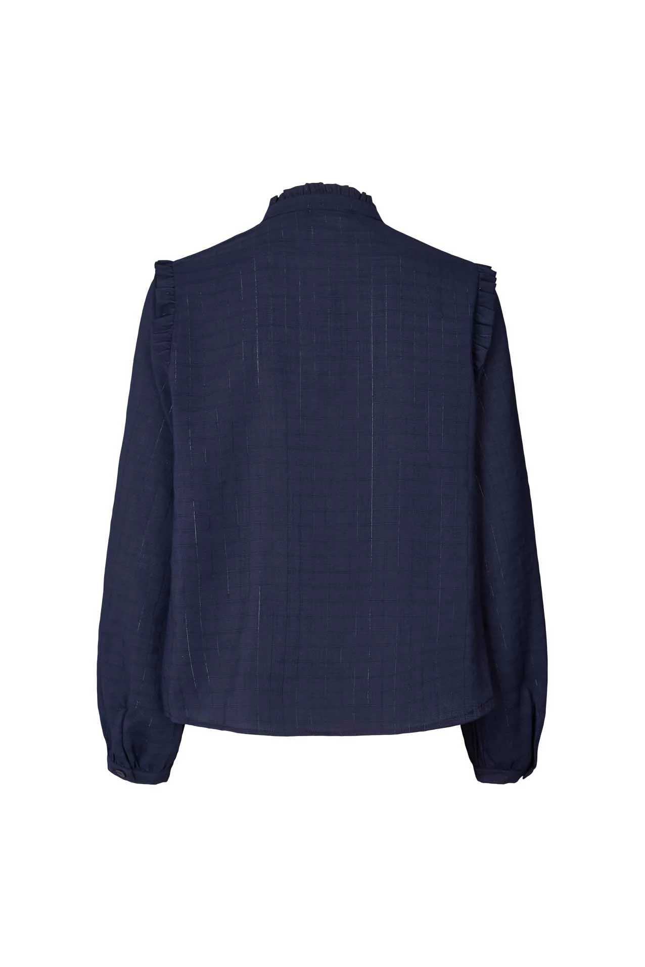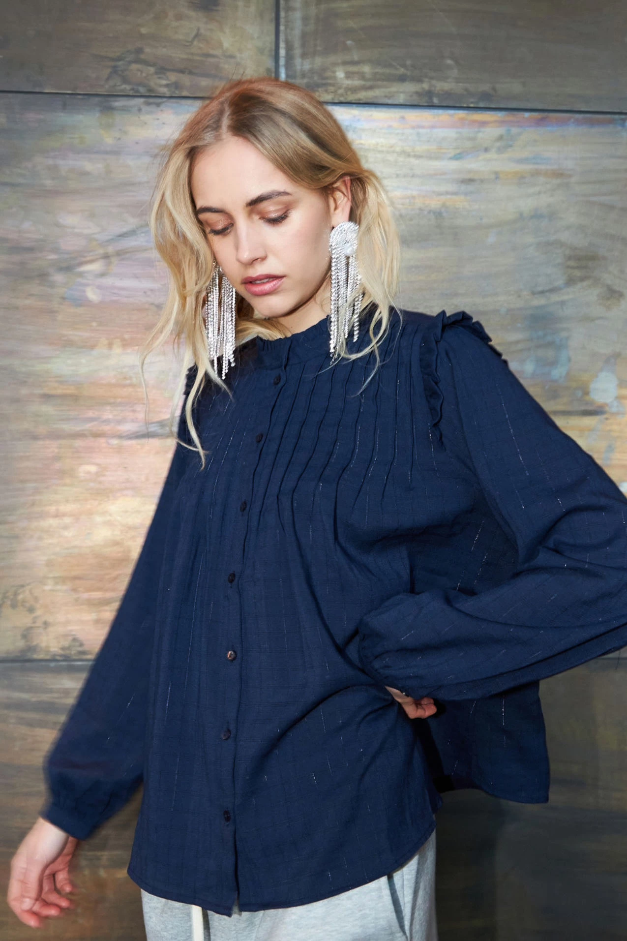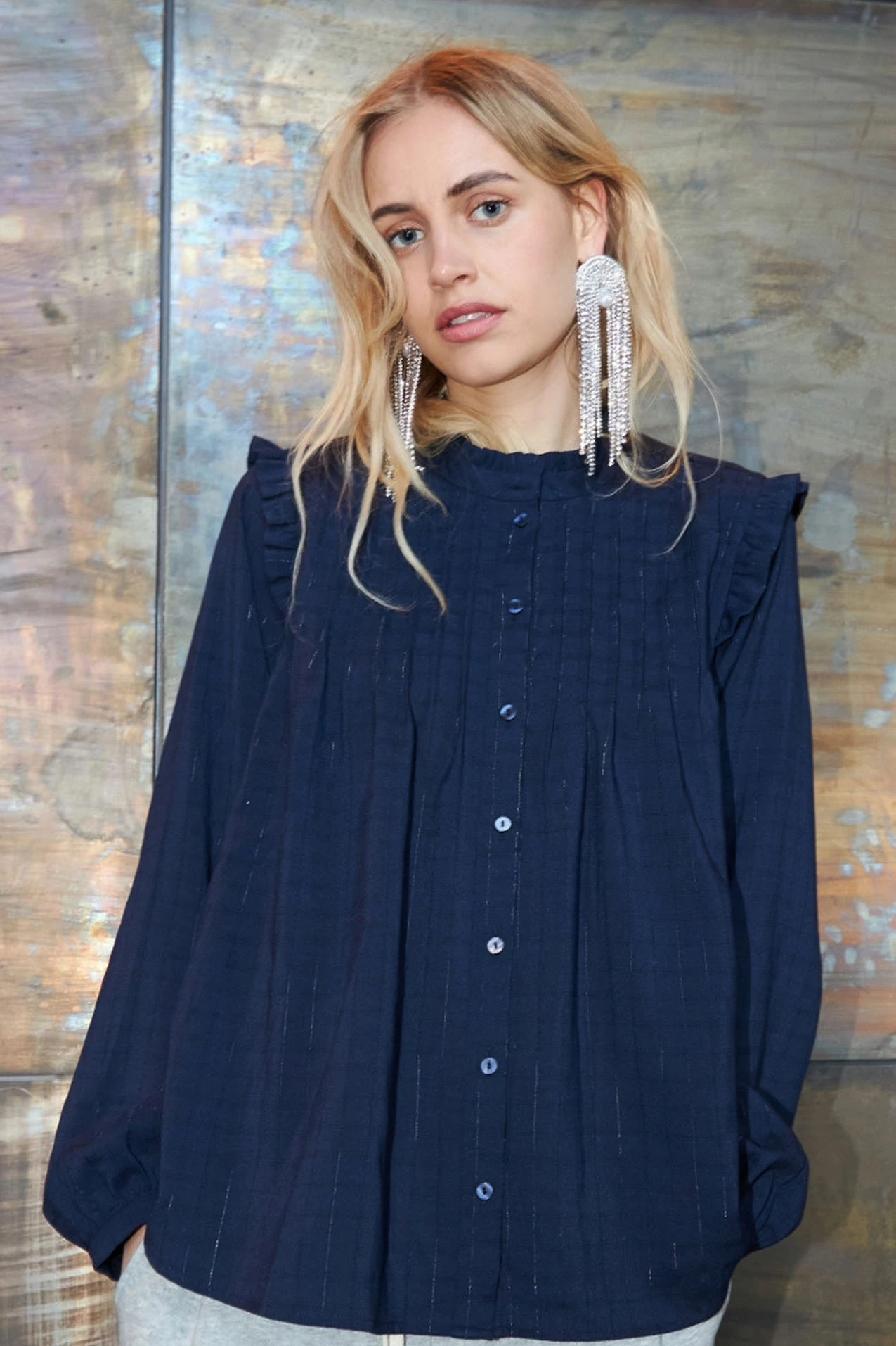 Button down front, frill detail on shoulders Long sleeves with buttoned cuffs Semi sheer navy fabric with a subtle gold lurex stripe.