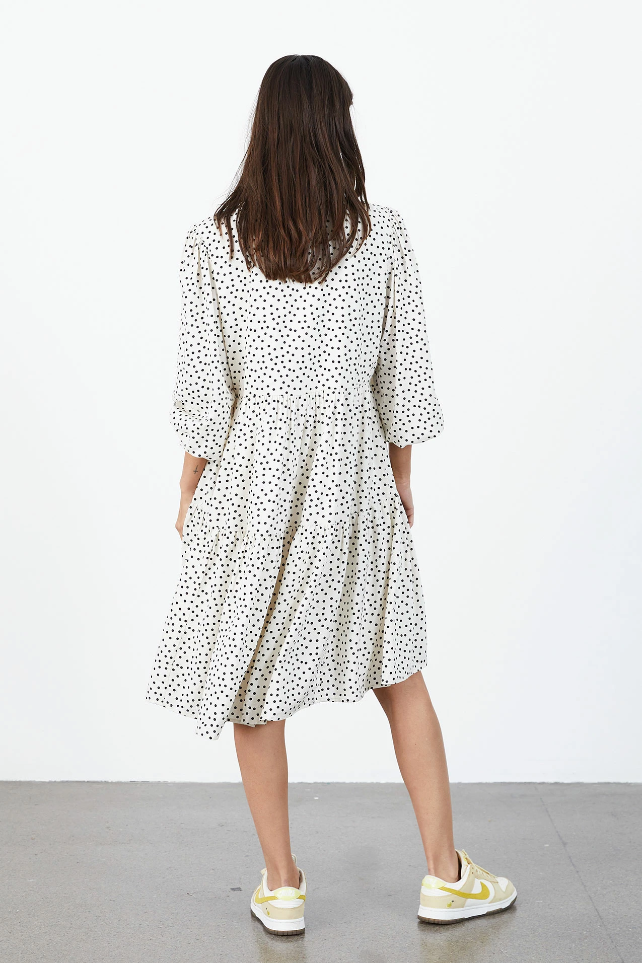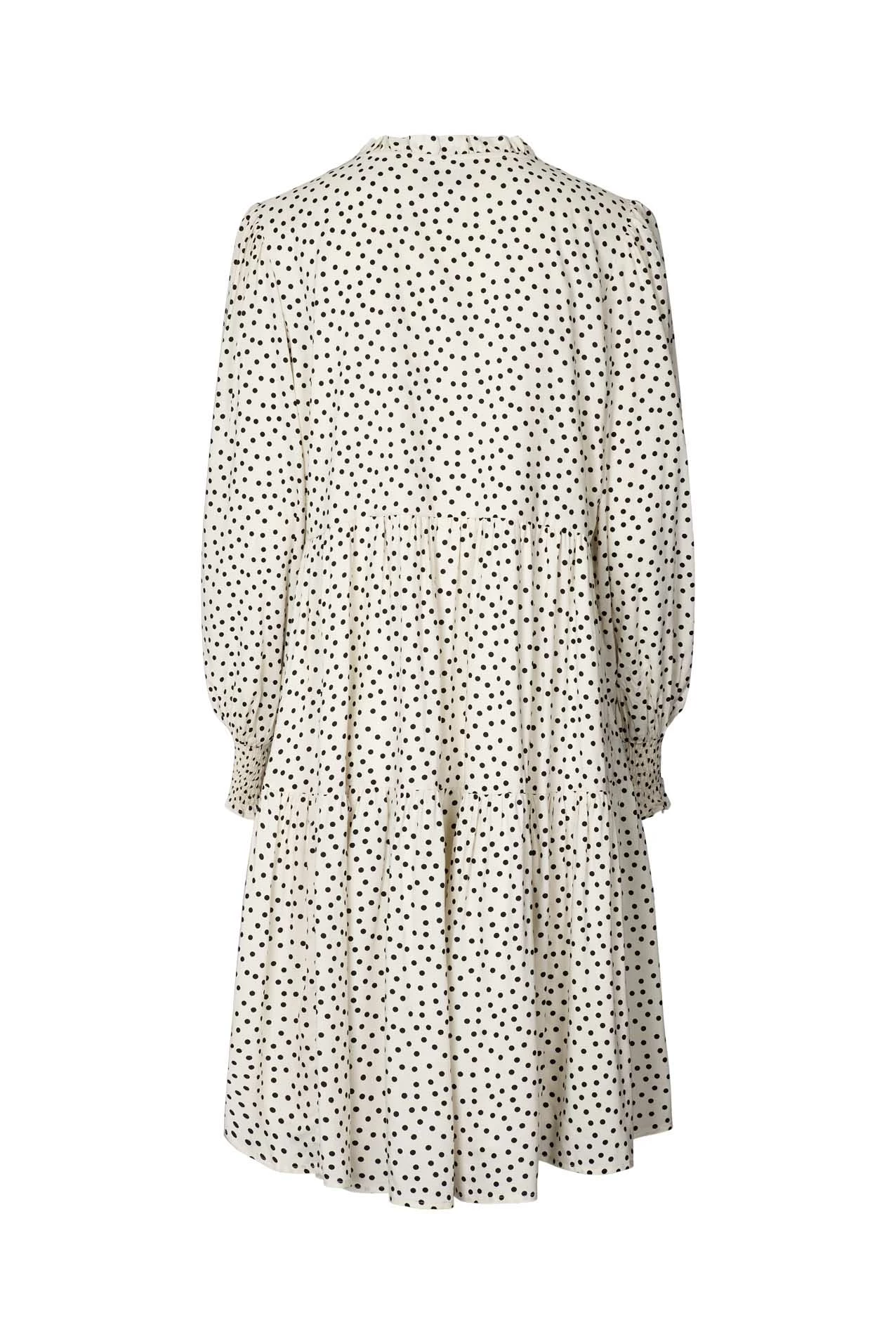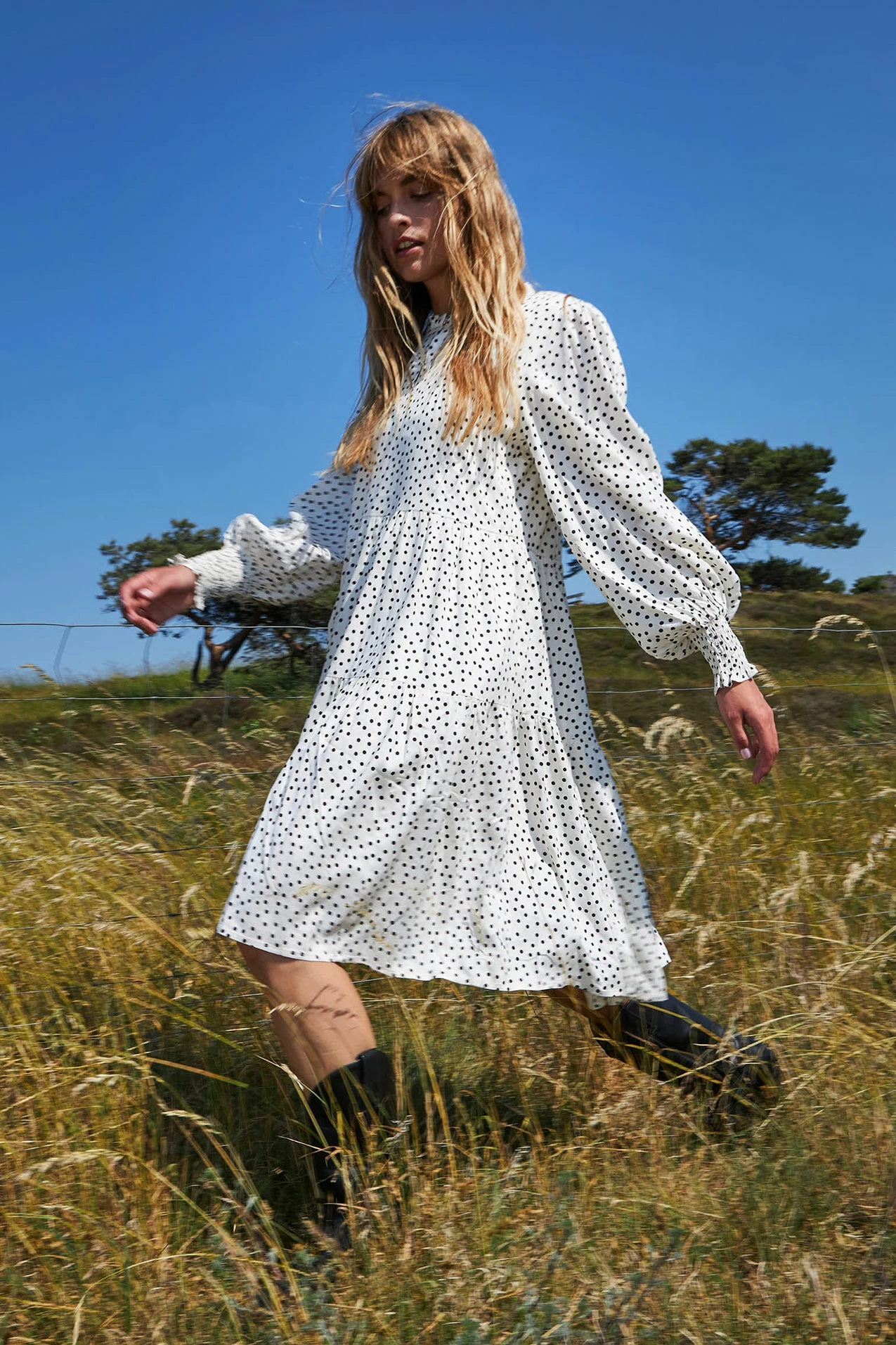 We love a beautiful and easily styled dress, and this piece is exactly that. It has long sleeves with smock and round neckline with button opening. The skirt consists of two panels and has side pockets. The length is a bit longer to the back than the front, and the fit of the dress is normal.