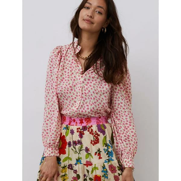 A beautiful pink floral blouse, easy wear with voluminous sleeve and bib detail. The front has press stud fastenings so you can choose to wear the top buttons undone. A versatile top for work or for leisure. The length is perfect for jeans or can be tucked into trousers and skirts. Style: Lollys Laundry Frankie Shirt Composition: 100% polyester Care: Machine wash cold