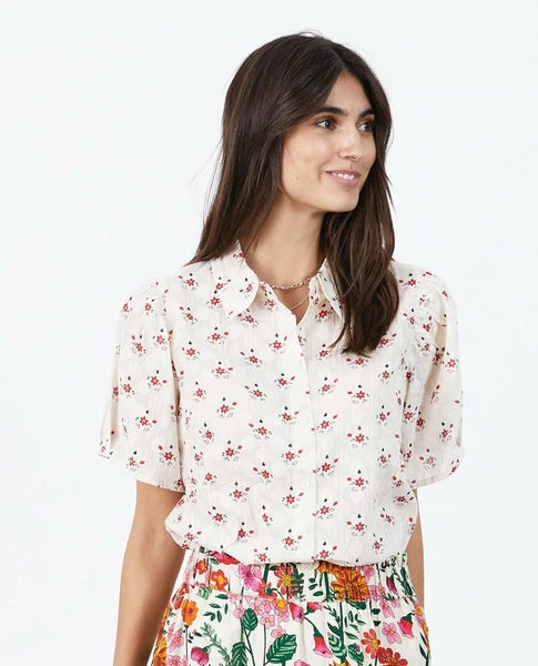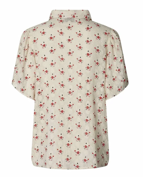 Lollys Laundry Gambia Cream Shirt, a patterned blouse in a classic fit with repeat floral pattern in black and red. The shirt has short sleeves, collar and front placket button opening. It is normal fit and suitable with any bottom. 100% BCI Cotton