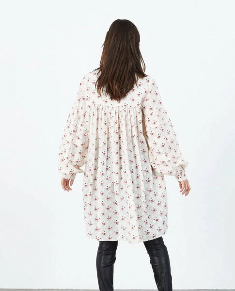 Lollys Laundry Georgia Cream Dress, a short dress in voluminous fit. Cut above the chest to create gatherings to the front, the Georgia dress has long sleeves, v-neckline and tie detail. Can easily be worn as a tunic over jeans if preferred. 100% BCI Cotton
