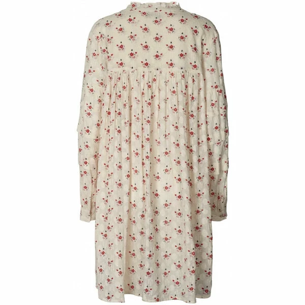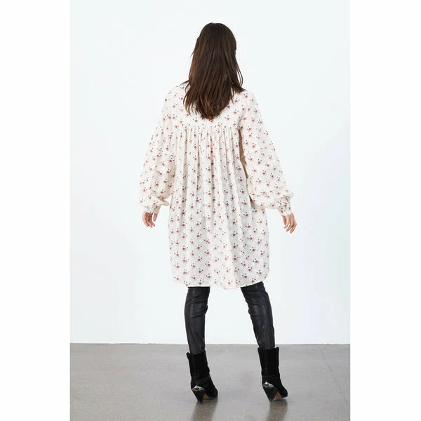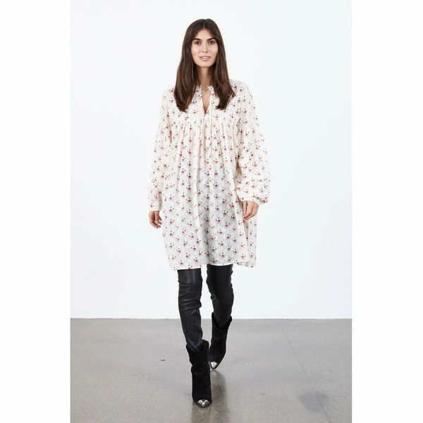 The cutest short dress with a voluminous fit. This dress has a cut above the chest which creates gorgeous gatherings. It is designed with long sleeves and a v-neckline with straps to close it up if preferred together with a small frill detail. The dress is normal fit, and can also easily be used as a tunic mixed with cool jeans. Quality: 100% Cotton
