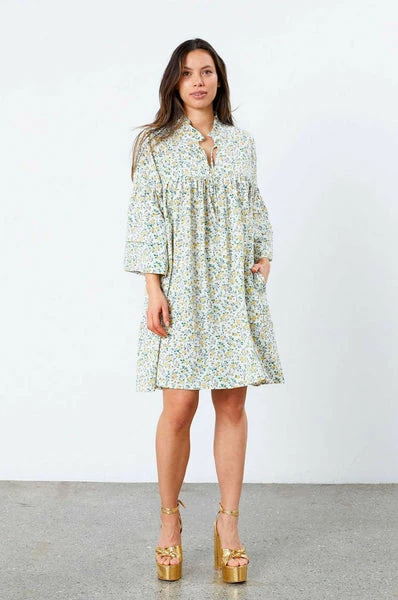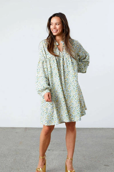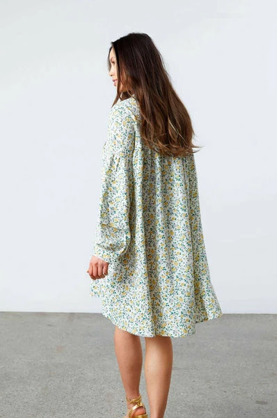 The cutest short dress with a voluminous fit to swish and sway your way through summer. The cut above the chest creates gorgeous gatherings with a v-neckline and straps that can be closed if preferred together with a small frill detail. We love it styled with a chunky heel or as a tunic with slim cut jeans in cooler weather. – V neckline with frilled collar and ties – Long sleeves with cuffs – Pleated yoke at the front – All over yellow and green floral pattern on an off-white base – Short length – Oversized fit XS S M L Chest (cm) 47 50 53 56 Front length (cm) 92 93 94 95 Back length (cm) 94 95 96 97 97% Polyester, 3% Spandex Machine wash at 30 on delicate cycle. Do not tumble dry. Iron on low heat. Shrinkage up to 3-5%. Made in China 22240_3033 74