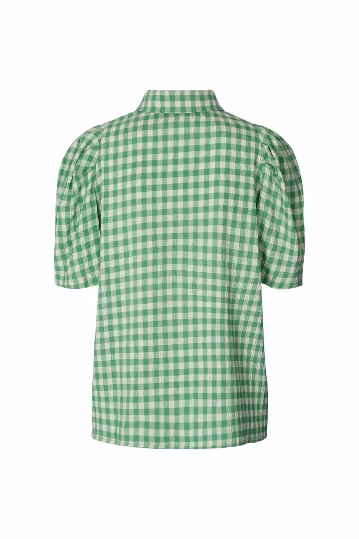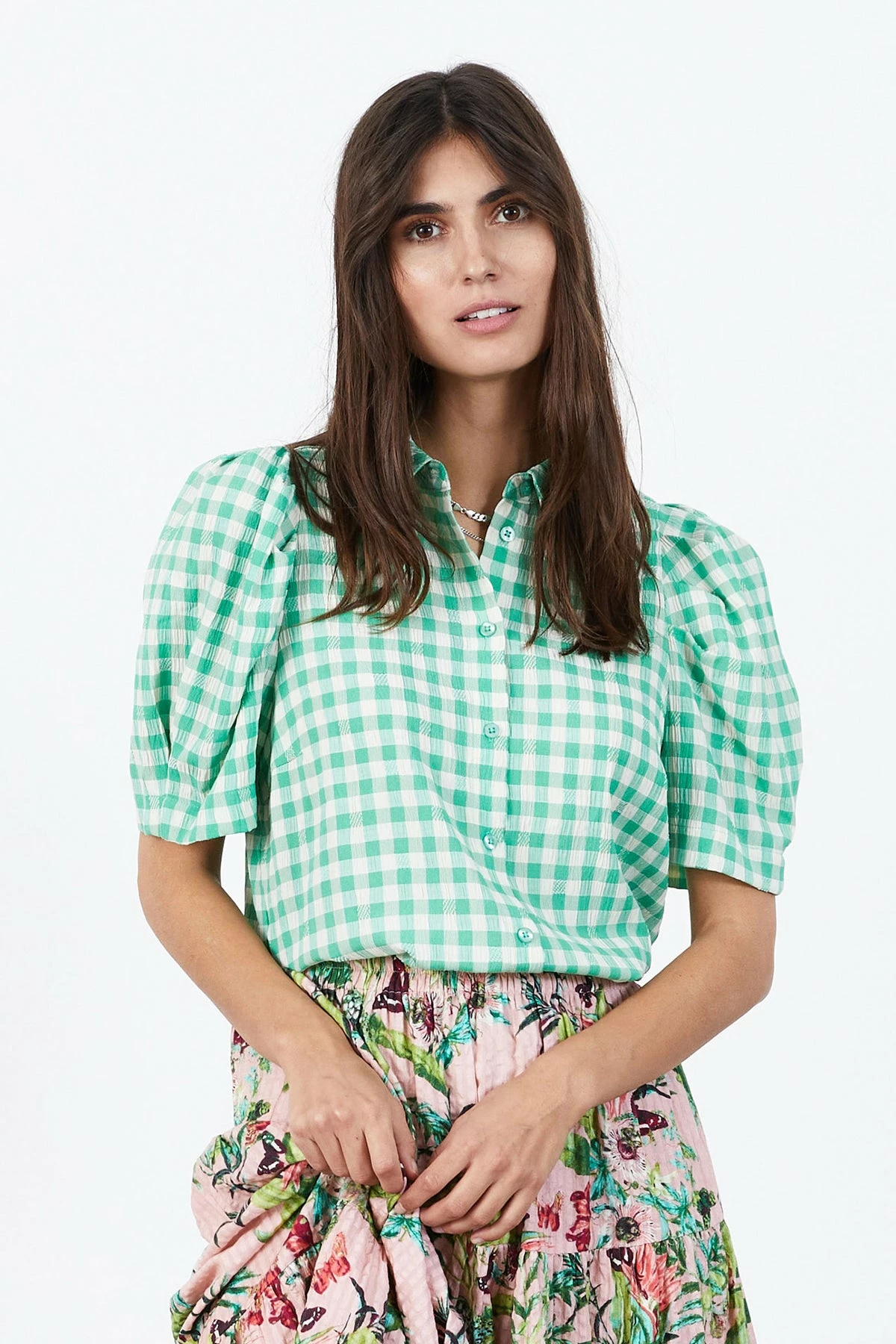 A classic short sleeve shirt with a delicate puff at the shoulders. It has a buttoned opening and a shirt collar.