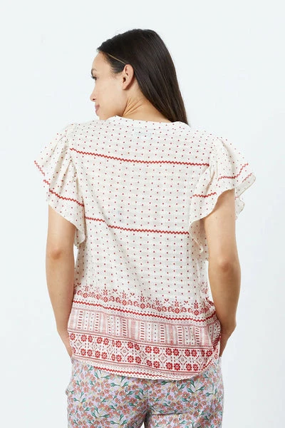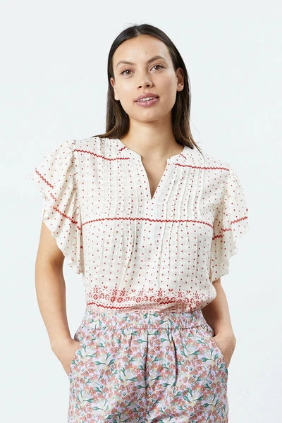 Designed in a classic and elegant fit we are very excited about this new piece. The top has a round neckline with a closure on front, which makes it a v-neck when used open. We absolutely adore the beautiful pleating on the chest together with the short sleeves with frills. Taking something classic and giving it a unique twist is what Lollys Laundry is all about. It is one centimeter longer to the back than the front and is true to size. Comes in a cream white with red dots. Style it with the matching Tanya Skirt – Dot Print from Lollys Laundry. Quality: 100% Cotton