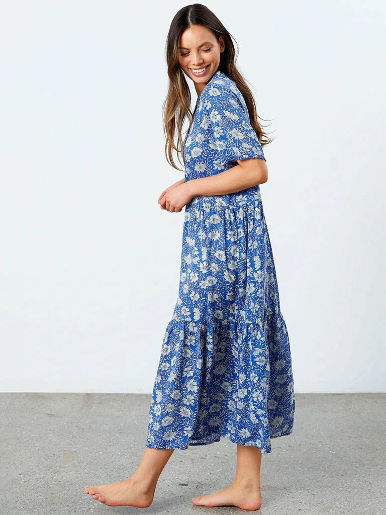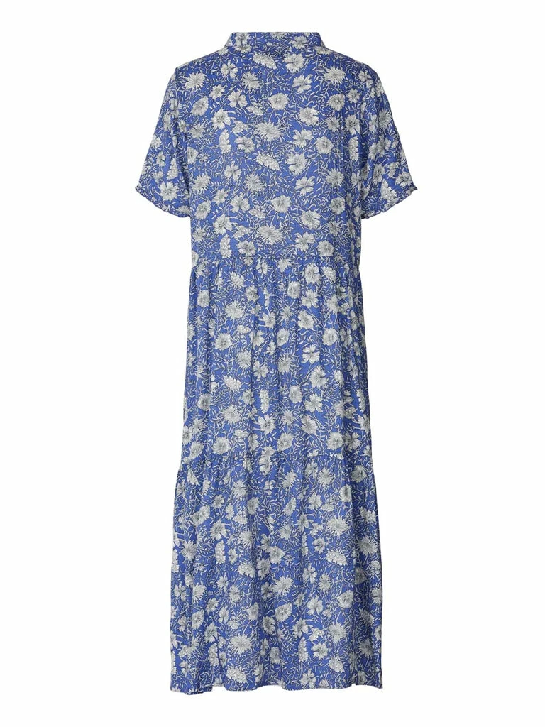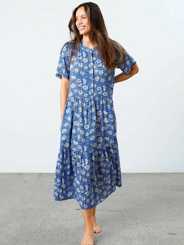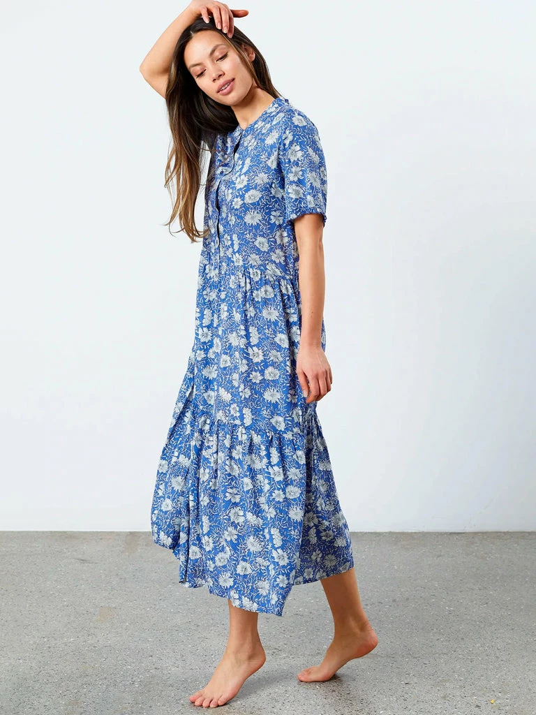 The Fie Dress from Lolly’s Laundry has a round neckline with a front placket opening down to the chest and short sleeves with cute small frills. The dress cuts at the waist and is in maxi length. The skirt consists of three panels. The dress comes in a slightly loose-fitting. 100% Viscose Tiered maxi dress Round neckline Front placket opening Short sleeves