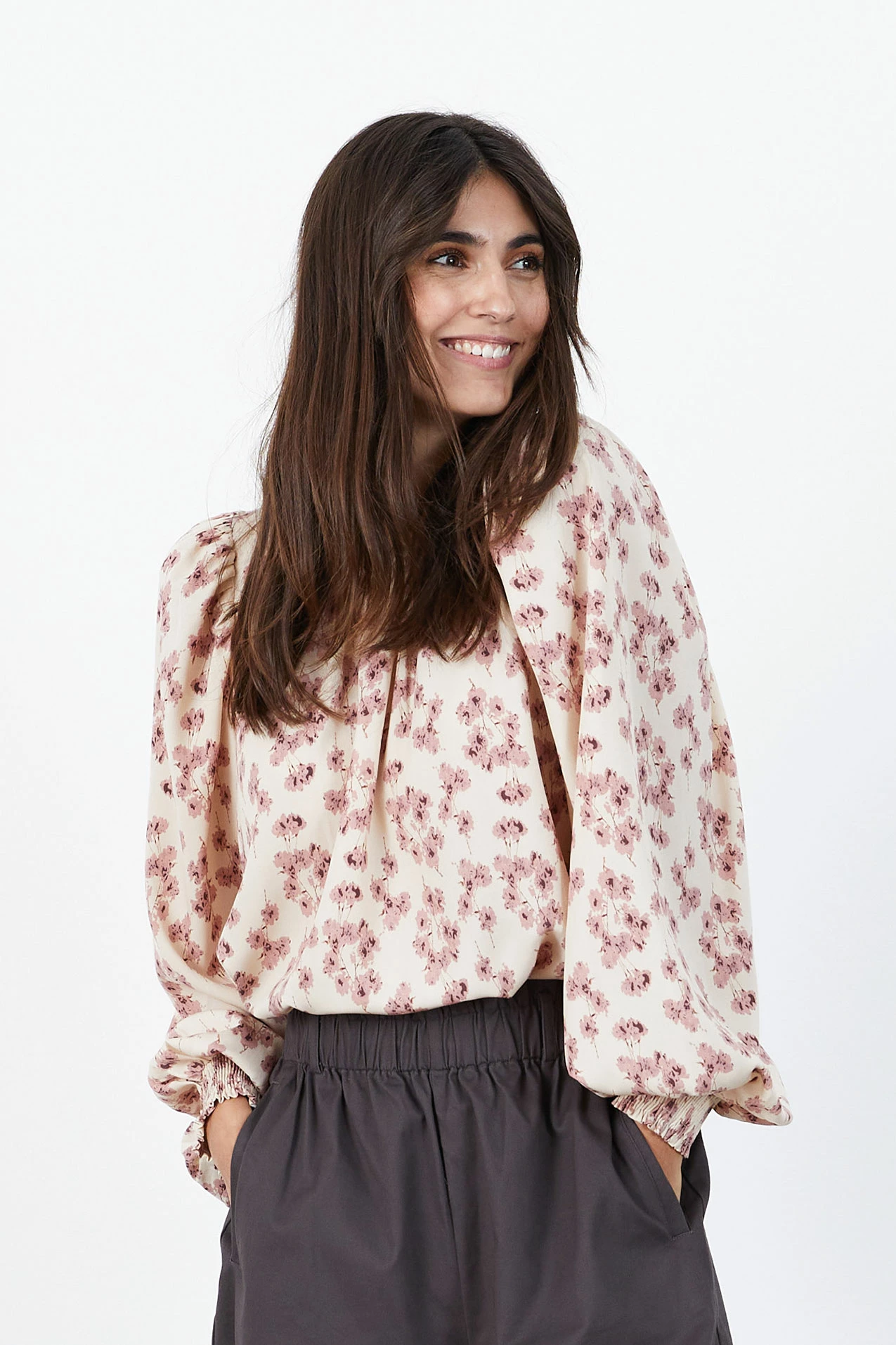 his style is both feminine and cool. It is designed with a round neckline with small gatherings at neck and long, loose sleeves with smock at wrists together with puffs at shoulders. Such a darling in your wardrobe which you can style to every bottom and occasion.