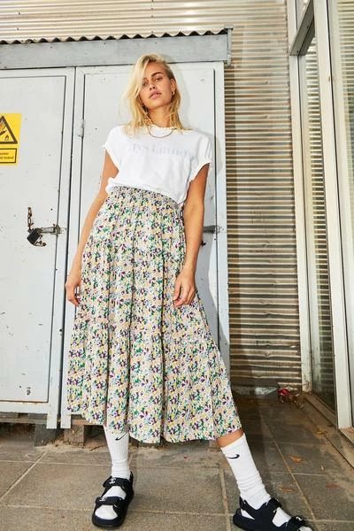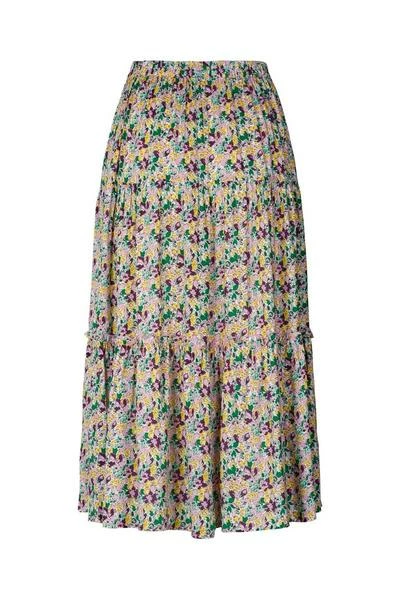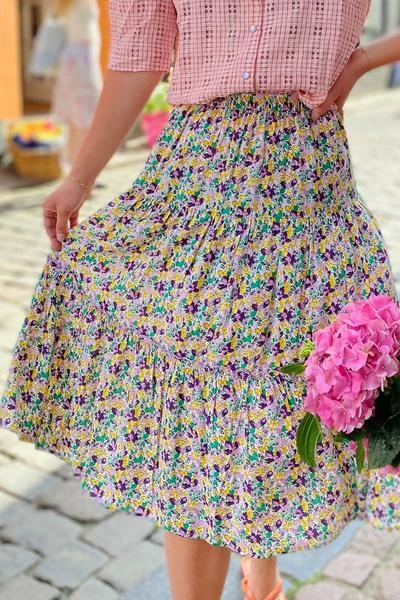 The perfect flowy midi skirt with a flowery pattern in yellow, green and purple . It has an elasticated waist with an A-line cut. Perfect to dress up and down. 100% EcoVero Viscose