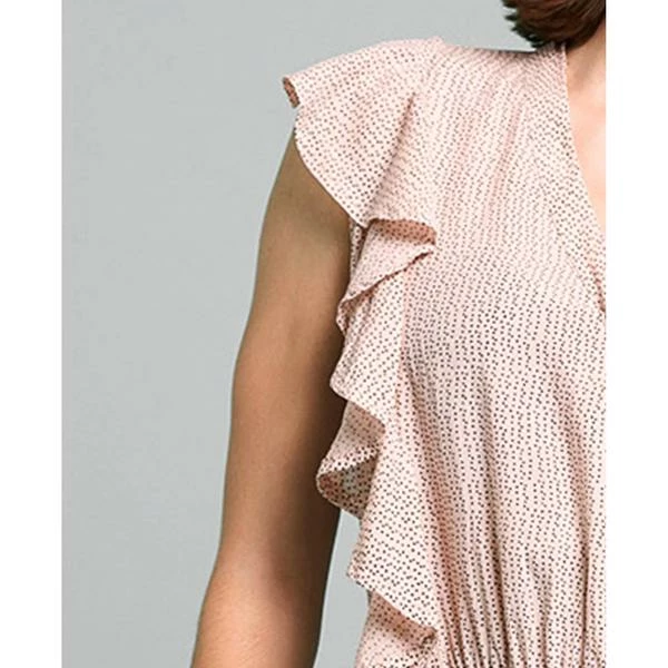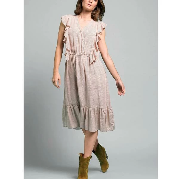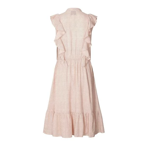 A knee-length dress with frill skirt, v neckline and waterfall frill from shoulder to waist. The soft cotton fabric is a pale pink with a very small black dot. This fabric is also available in the Heather top. Style: Lollys Laundry Ramona Dress Pink Dot Composition: 100% viscose Care: Machine wash cold. Fit: True to size