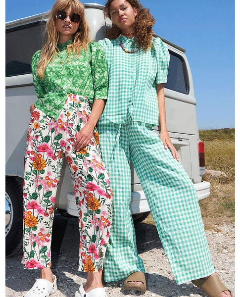Lollys Laundry Rita Green Trousers, a green and white checked pair of gingham trousers with a stretchy drawstring waistband and pockets. Straight fitting with a wide palazzo style leg the Rita trousers are lightweight and great for warm Summer days with a simple vest or a billowing blouse. 80% Polyester & 20% Viscose Machine wash at 30 XS – UK8, S – UK10, M – Uk12, L – UK14 Size down if between sizes MEASUREMENTS: XS: Waist 64 cm / Length 78.6 cm S: Waist 68 cm / Length 78.8 cm M: Waist 72 cm / Length 79 cm L: Waist 76 cm / Length 79.2 cm