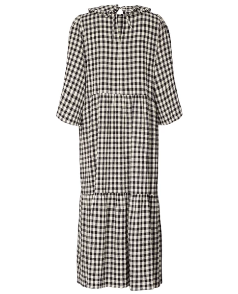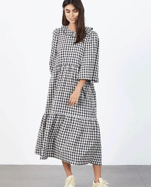 Lollys Laundry Sonya Black Dress, a lightweight black and white gingham midi dress with a loose and oversized fit and wide 3/4 length sleeves. Falling to the calf in length the Sonya dress has a tiered skirt, a frilly oversized collar and a tie at the back of the neck. Also available in blue this checked dress is subtly textured and has practical side pockets. 80% Polyester & 20% Viscose Machine wash at 30 XS – UK8, S – UK10, M – UK12, L – UK14 Size down as Lolly’s is oversized MEASUREMENTS: XS: Chest 94 cm / Length 123 cm S: Chest 98 cm / Length 124 cm M: Chest 102 cm / Length 125 cm L: Chest 106 cm / Length 126 cm