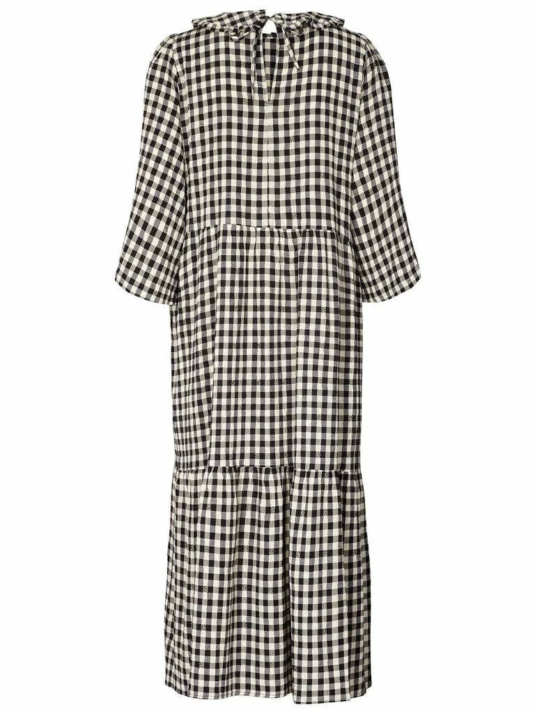 The Sonya Dress from Lolly’s Laundry gets the details just right. Patterned with gingham checks, this long dress is cut from a lightweight viscose mix. Featuring a detailed collar with tie closure at the back, cropped sleeves, a two panel skirt and cute side pockets. 80% Polyester, 20% Viscose Gingham check Long length Cropped sleeves Tie neck Tiered skirt Side pockets Machine wash cool