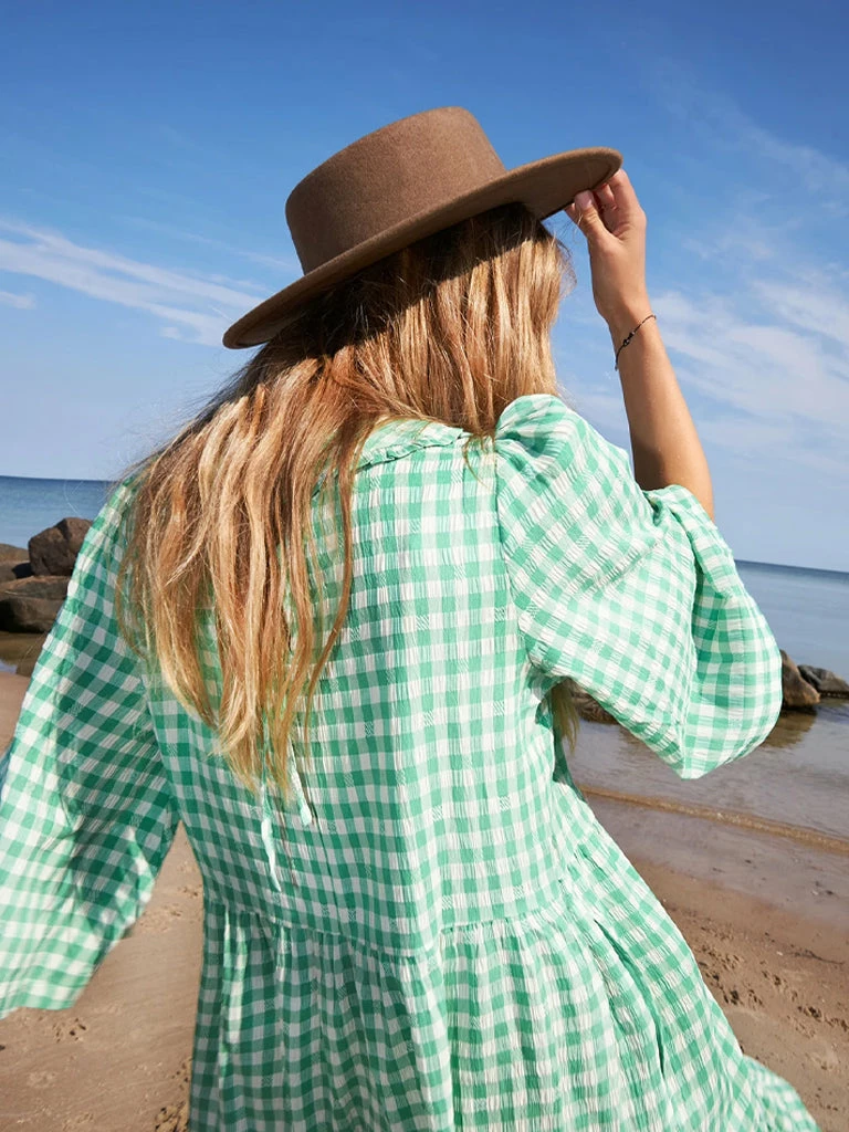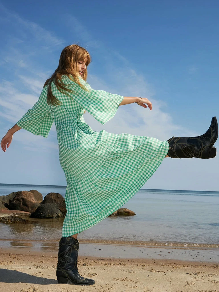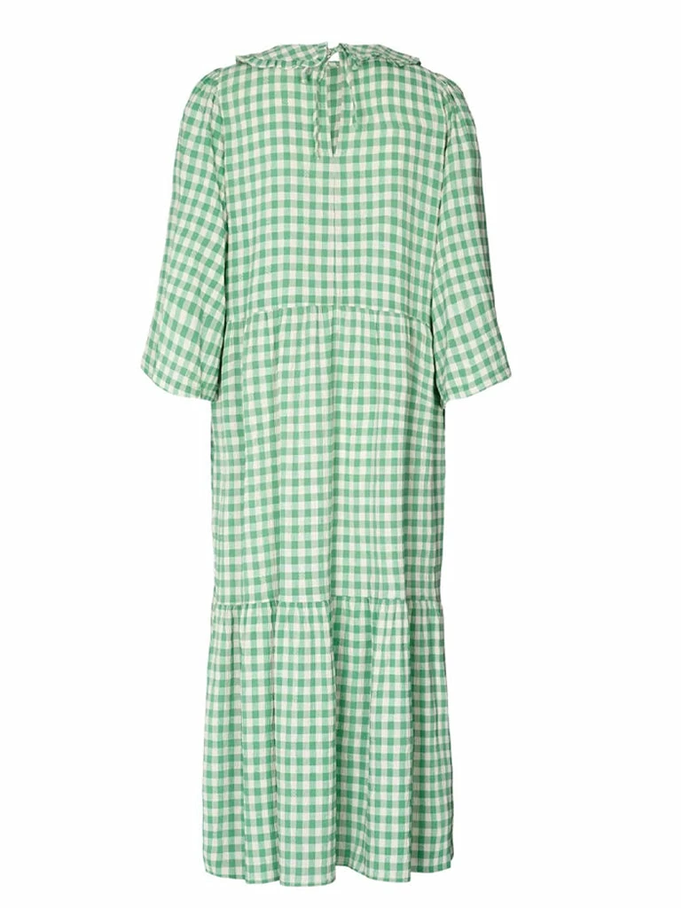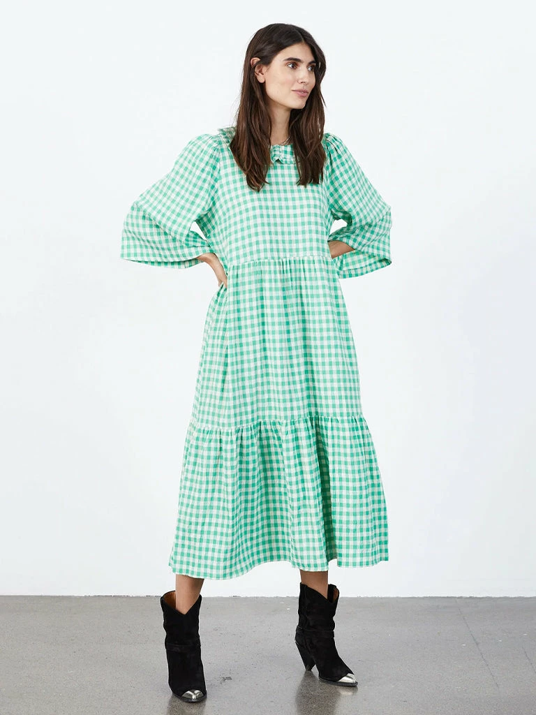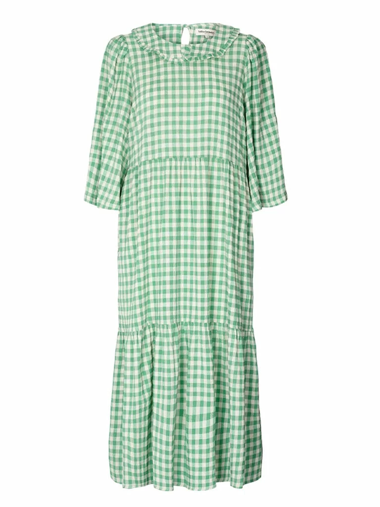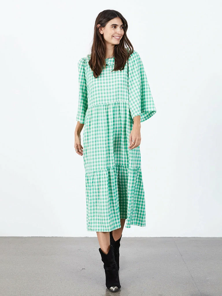The Sonya Dress from Lolly’s Laundry gets the details just right. Patterned with gingham checks, this long dress is cut from a lightweight viscose mix. Featuring a detailed collar with tie closure at the back, cropped sleeves, a two panel skirt and cute side pockets. 80% Polyester, 20% Viscose Long dress in Gingham check with wide cropped sleeves Cropped sleeves Tie neck Tiered skirt Side pockets Machine wash cool