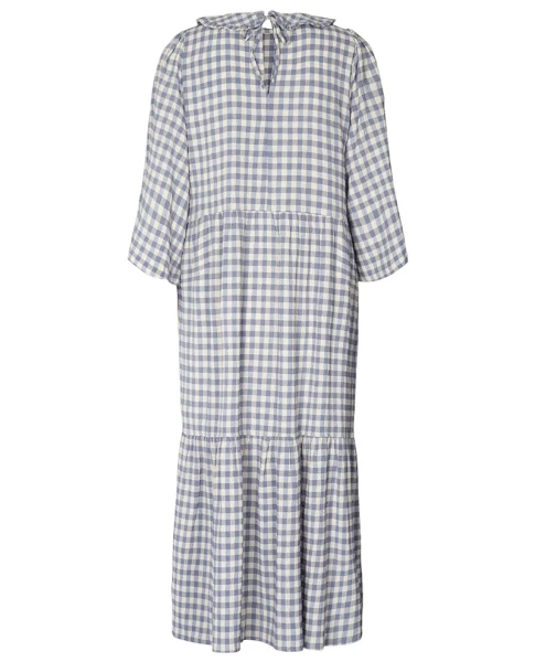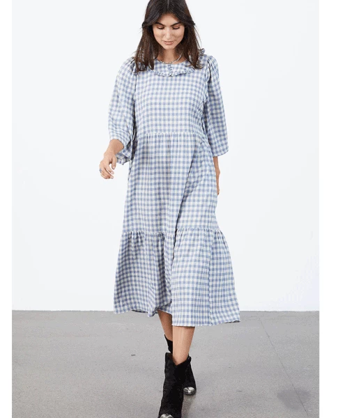 Lollys Laundry Sonya Dusty Dress, a lightweight pale blue and white gingham midi dress with a loose and oversized fit and wide 3/4 length sleeves. Falling to the calf in length the Sonya dress has a tiered skirt, a frilly oversized collar and a tie at the back of the neck. Also available in black this checked dress is subtly textured and has practical side pockets. 80% Polyester & 20% Viscose Machine wash at 30 XS – UK8, S – UK10, M – UK12, L – UK14 Size down as Lolly’s is oversized MEASUREMENTS: XS: Chest 94 cm / Length 123 cm S: Chest 98 cm / Length 124 cm M: Chest 102 cm / Length 125 cm L: Chest 106 cm / Length 126 cm
