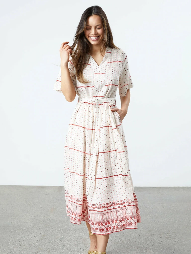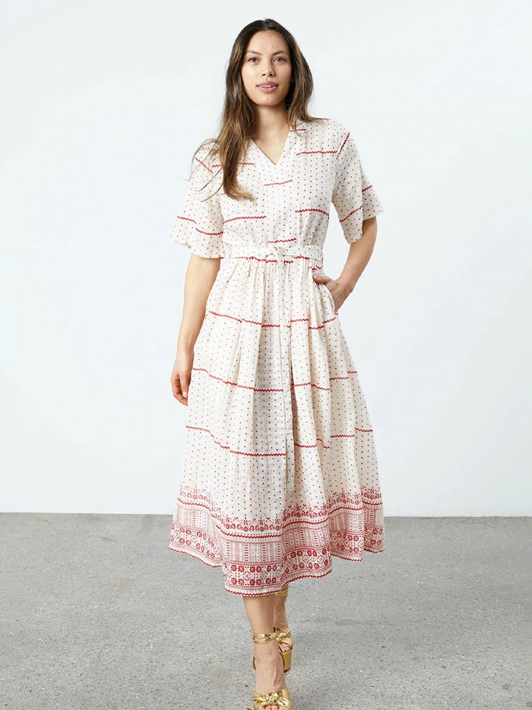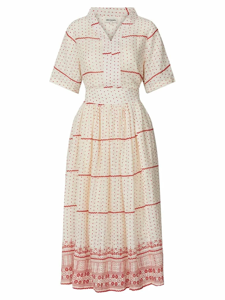 The Sumia Dress from Lolly’s Laundry is crafted from 100% cotton with unique dot and floral detailing. Midi in length, the dress has short sleeves, a v-neckline and a longer, spacious skirt. Finished with a matching belt and side pockets. 100% Cotton / Lining: 100% Cotton Midi dress with unique floral detailing V neckline Spacious skirt Matching belt Side pockets