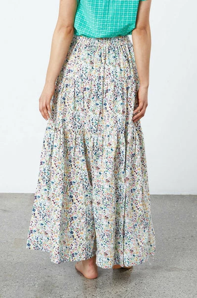 We love the versatility of the Sunset Skirt from Lolly’s. Create an effortlessly cool look with a chunky knit and boots or keep it whimsical and romantic with a tucked-in blouse and sandals. – 3 tiered skirt with gentle gatherings – Elasticated waist – Voluminous body – Normal to small fit XS S M L Waist relaxed (cm) 58 62 66 70 Waist stretched (cm) 108 112 116 120 Length (cm) 98 99 100 101 100% Cotton Wash on delicate cycle at 30. Do not tumble dry. Iron on low heat. Shrinkage up to 3-5%. Made in China 22241_4008 74