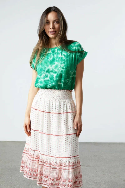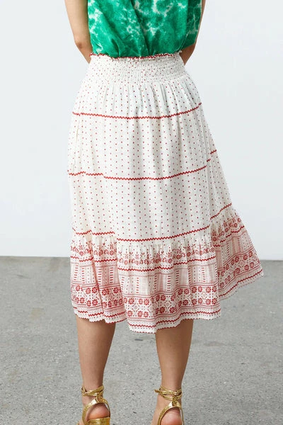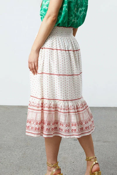 If you know us, you know that we absolutely love skirts and all of the styling possibilities. Our Tanya skirt is one of our newest member in our assortment of gorgeous skirts. This one is midi length, has a wider piece of smock at waist and consists of two panels. Comes in a cream white with red dots. Style it with the matching Isabel Top – Dot Print from Lollys Laundry. Quality: 100% Cotton / Lining: 100% Cotton