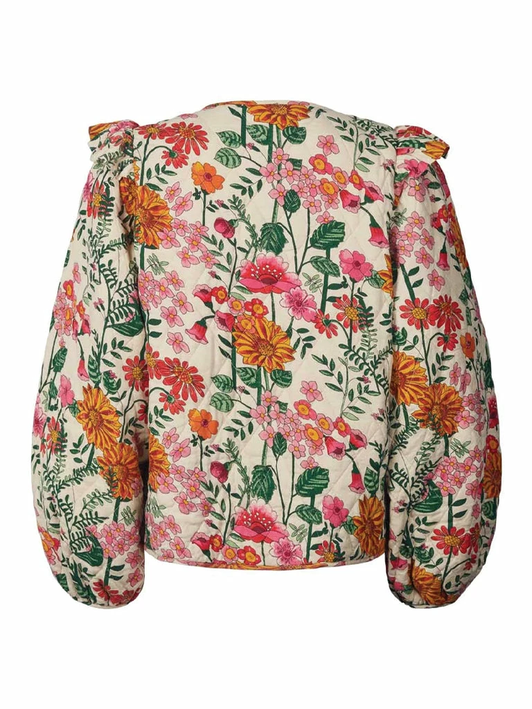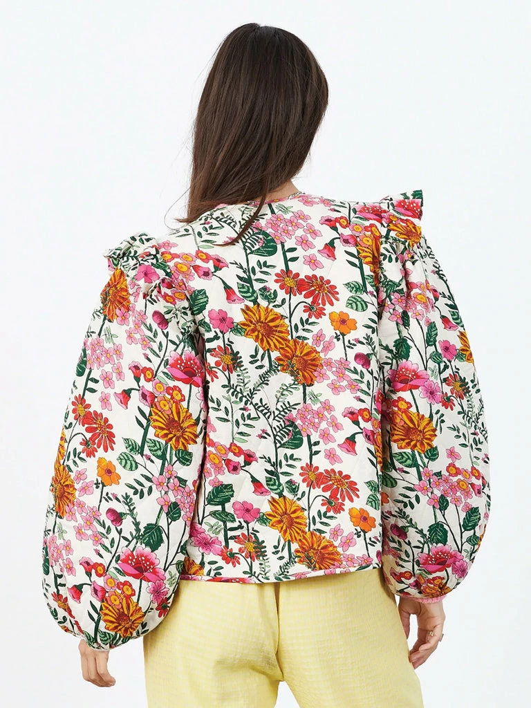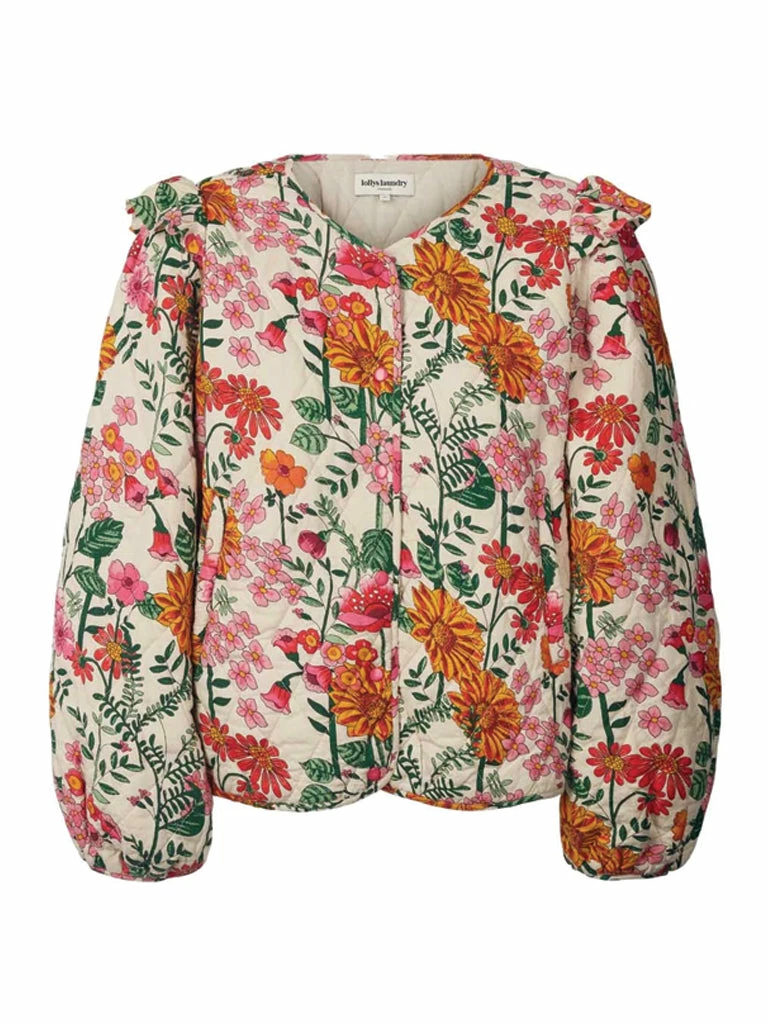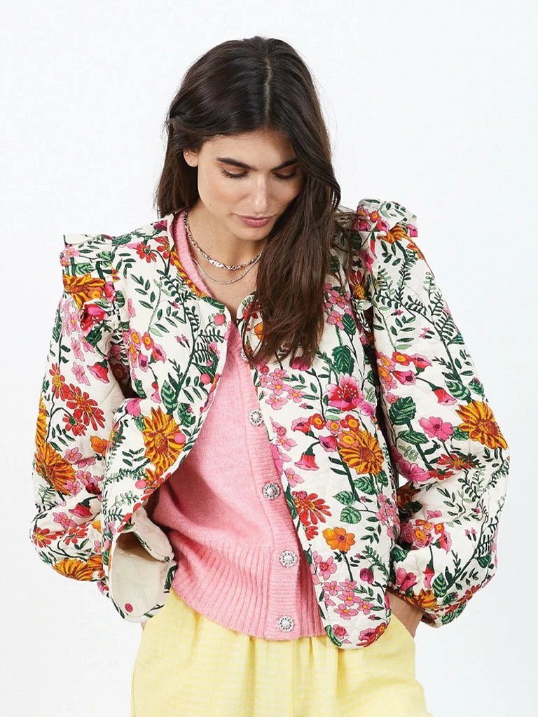 The Ulla Jacket from Lolly’s Laundry is short and quilted with a colourful floral pattern. The jacket has a front placket opening with buttons and round neckline, and is finished with long voluminous sleeves and frill details on shoulder. Perfect as a transitional item during spring and fall. 100% Viscose Short quilted jacket with floral pattern Voluminous sleeves Frill detailing on shoulder Centre front button placket Unique floral pattern