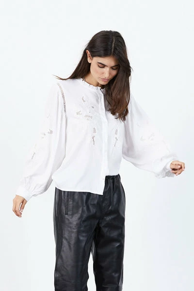 Such a gorgeous shirt with feminine details. The shirt has long and voluminous sleeves with small cuffs, front button opening and frill at neckline. What makes it something special is the beautiful broderie anglaise at sleeves and front. MEASUREMENTS: XS: Chest 94 cm / Length 60 cm S: Chest 98 cm / Length 61 cm M: Chest 102 cm / Length 62 cm L: Chest 106 cm / Length 63 cm XL: Chest 110 cm / Length 64 cm Style no. 22114_2052Quality: 100% Viscose