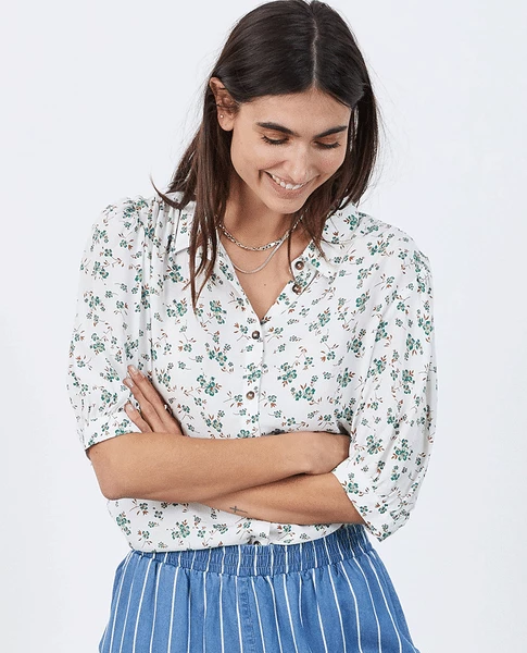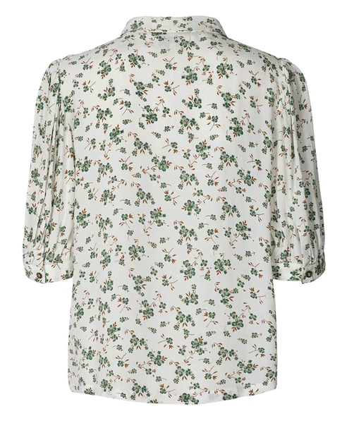 Lollys Laundry Zoe White Shirt, a white shirt covered in a green floral print with elbow length puffed sleeves. Fastening down the front with a row of brown buttons down the front the Zoe shirt has a pointed collar and a straight fit. 100% FSC Viscose Machine wash at 30 XS – UK8, S – UK10, M – UK12, L – UK14 MEASUREMENTS XS: Chest 94 cm / Length 58 cm S: Chest 98 cm / Length 59 cm M: Chest 102 cm / Length 60 cm L: Chest 106 cm / Length 61 cm