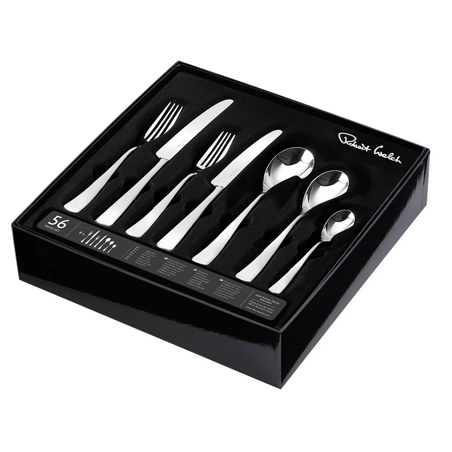 56 Piece Malvern Bright Cutlery Set by Robert Welch.The handles of Malvern cutlery flare softly to a gently curved base. Spoons and forks are made using the highest quality 18/10 stainless steel. Knife blades are made from specially hardened stainless steel to provide the finest possible cutting edge. All Malvern cutlery is available with a mirror finish.