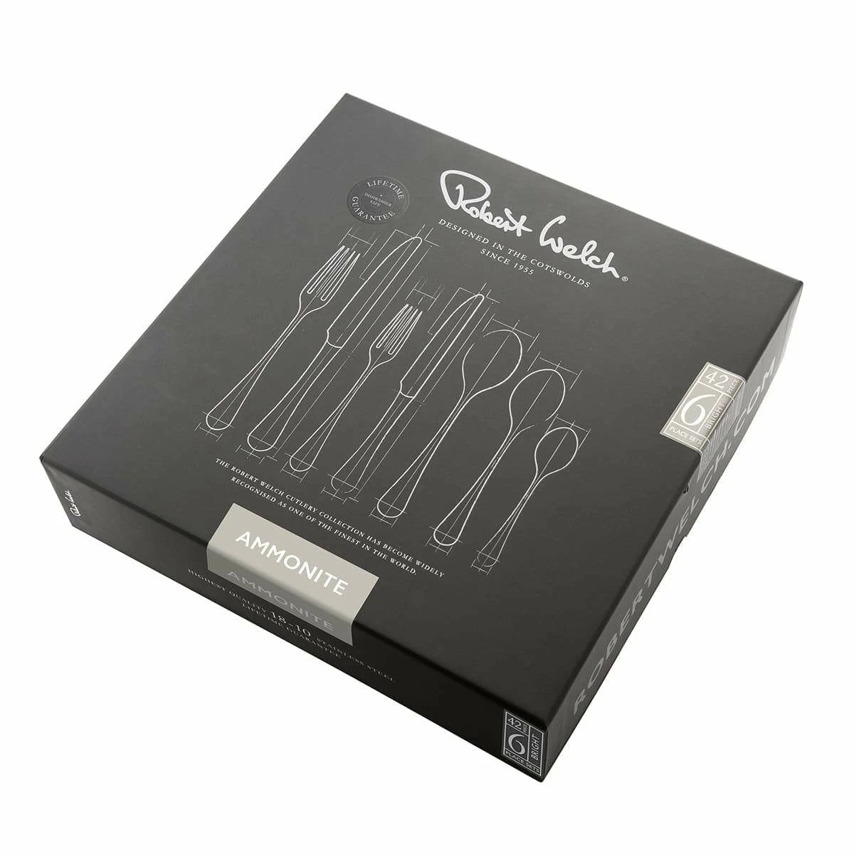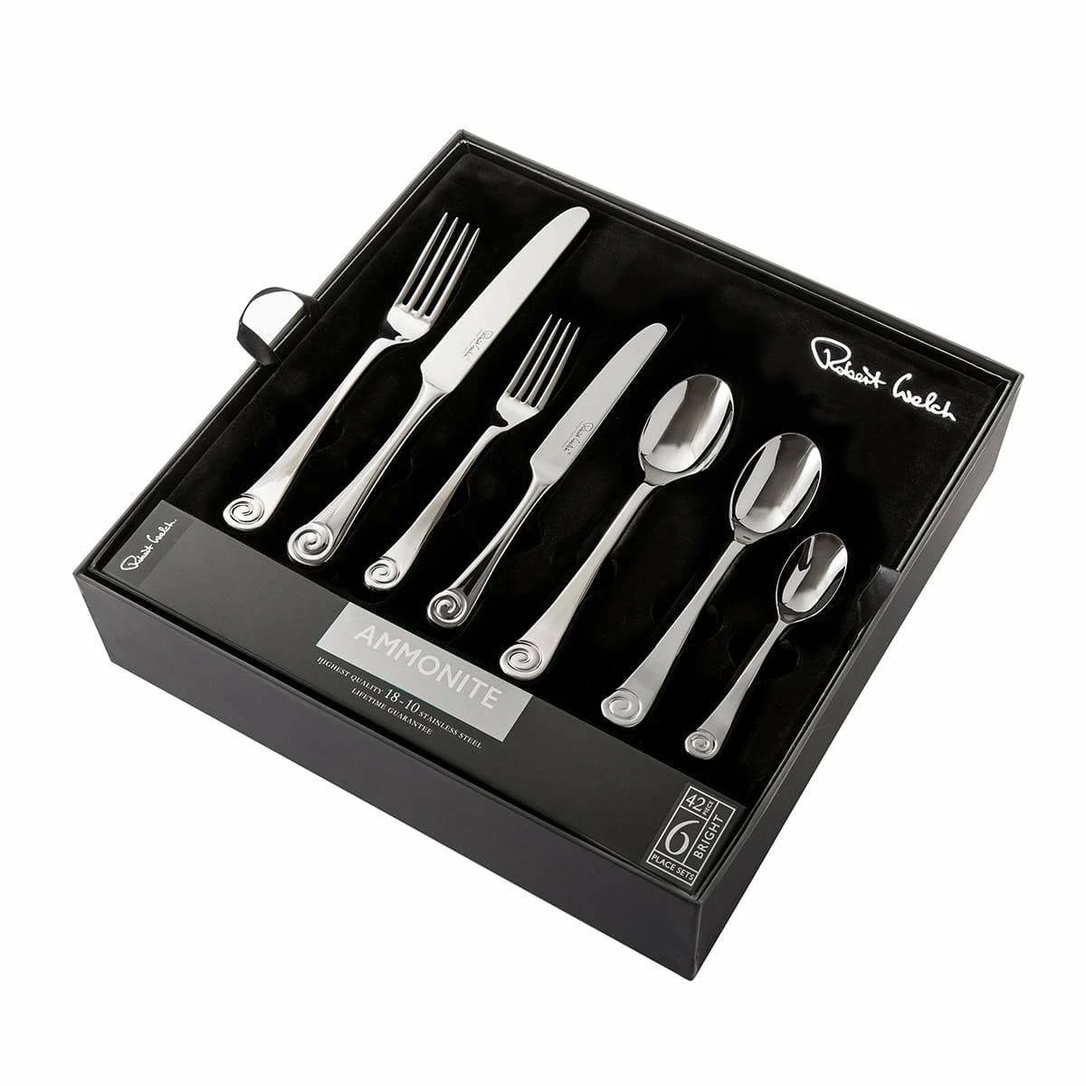 Inspired by the natural spiral of the fossil, Ammonite cutlery is a distinctive addition to any table. Spoons and forks are made using the highest quality 18/10 stainless steel. Knife blades are made from specially hardened stainless steel to provide the finest possible cutting edge. All Ammonite cutlery is available with a mirror finish, has a lifetime guarantee and is dishwasher safe. CONSISTS OF: Table Knife (6), Table Fork (6), Soup Spoon (6), Side Knife (6), Side Fork (6), Dessert Spoon (6), English Teaspoon (6)