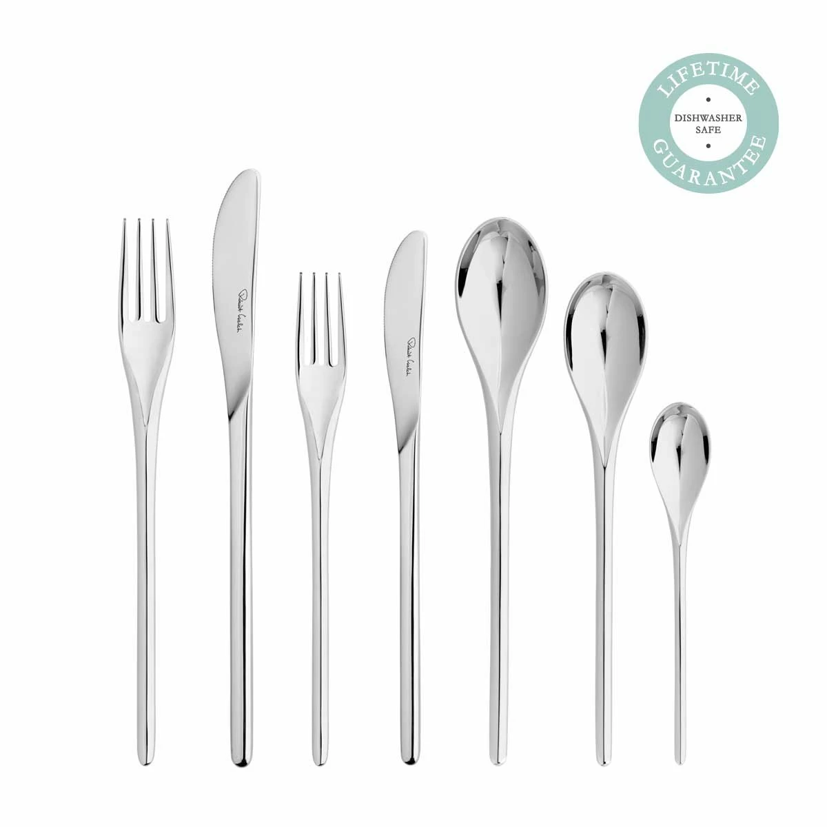 Bud cutlery has a slender handled design which curves elegantly into the palm of the hand. Spoons and forks are made using the highest quality 18/10 stainless steel. Knife blades are made from specially hardened stainless steel to provide the finest possible cutting edge. All Bud cutlery is available with a mirror finish, has a lifetime guarantee and is dishwasher safe. CONSISTS OF: Table Knife (6), Table Fork (6), Soup Spoon (6), Side Knife (6), Side Fork (6), Dessert Spoon (6), English Teaspoon (6)