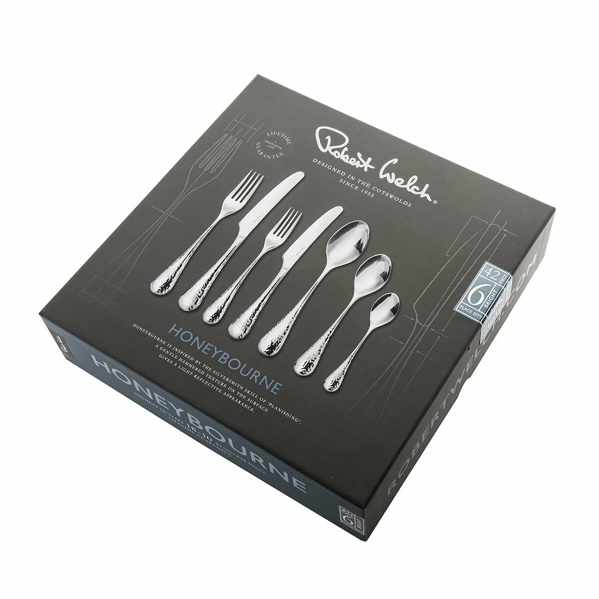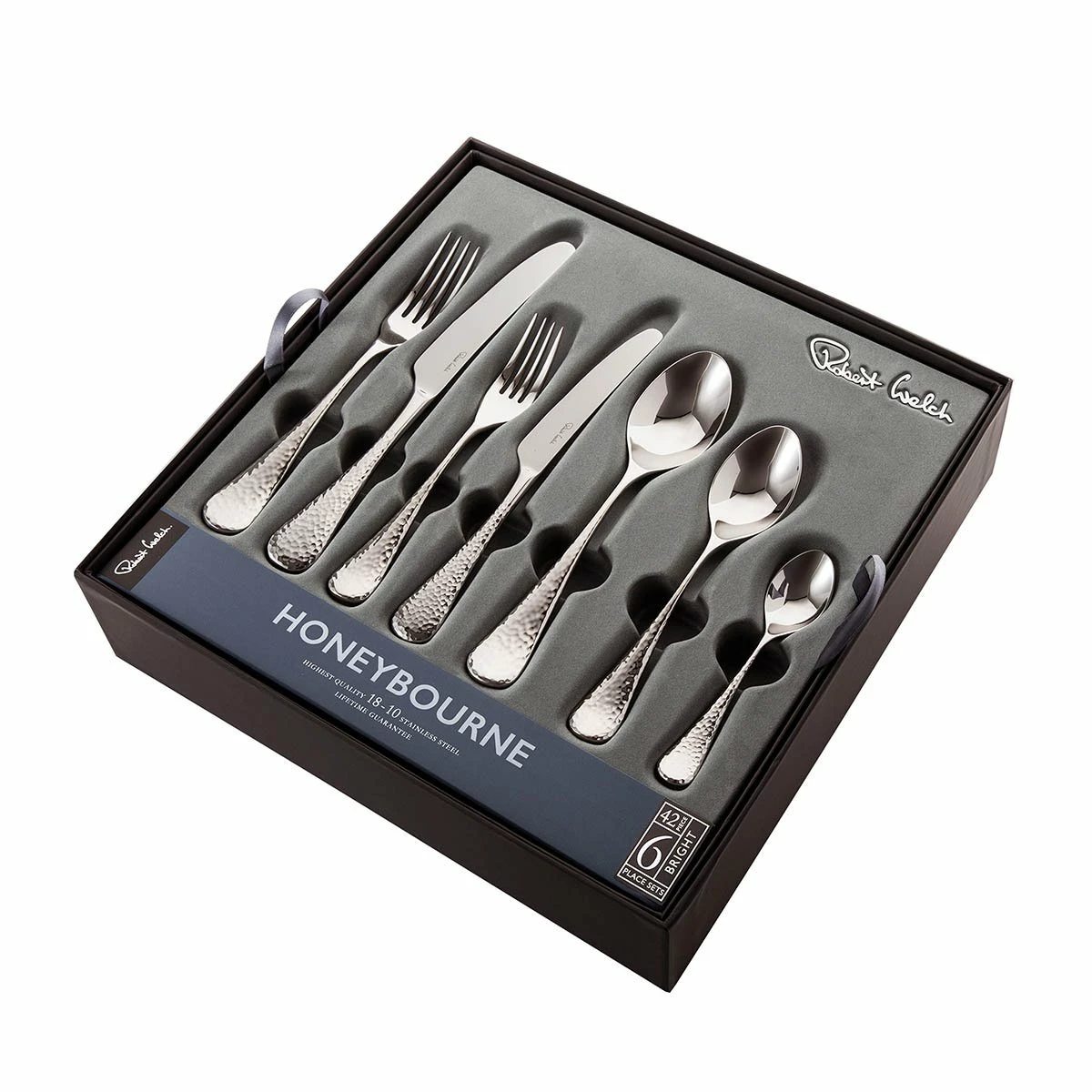Honeybourne is a versatile design suitable for the modern and traditional home alike, with classically proportioned long tines and a traditional heel. Handles feature a textured finish inspired by the silversmith technique of round hammer planishing. Spoons and forks are made using the highest quality 18/10 stainless steel. Knife blades are made from specially hardened stainless steel to provide the finest possible cutting edge. All Honeybourne cutlery is available with a mirror finish, has a lifetime guarantee and is dishwasher safe. CONSISTS OF: Table Knife (6), Table Fork (6), Soup Spoon (6), Side Knife (6), Side Fork (6), Dessert Spoon (6), English Teaspoon (6)