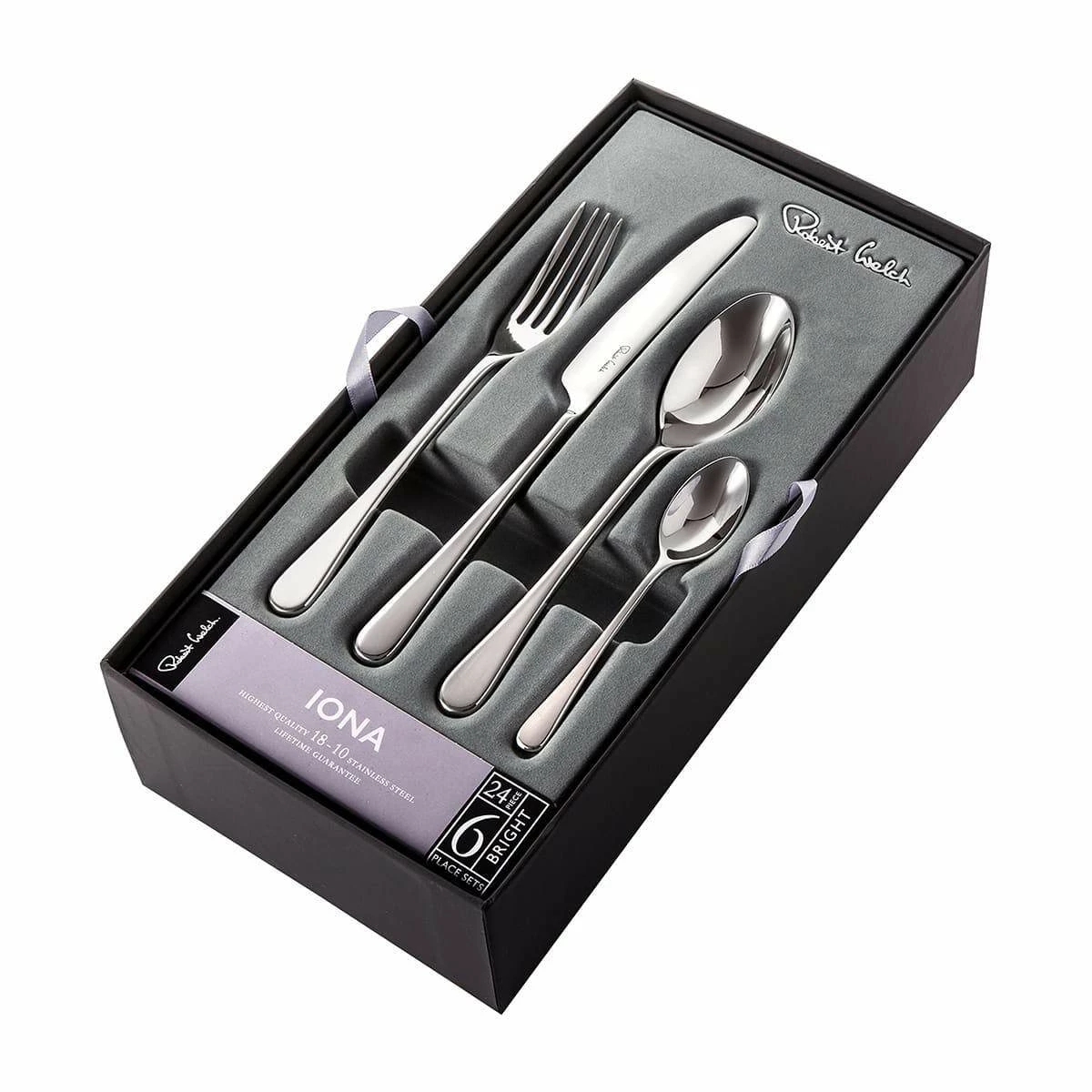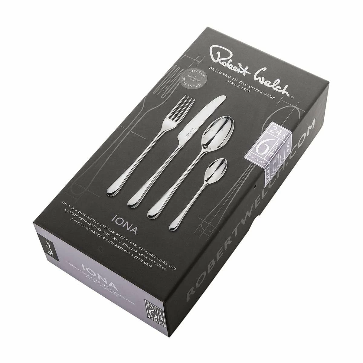 Iona cutlery has a slim and elegant profile providing surprising balance and comfort when in use. Spoons and forks are made using the highest quality 18/10 stainless steel. Knife blades are made from specially hardened stainless steel to provide the finest possible cutting edge. All Iona cutlery is available with a mirror finish, has a lifetime guarantee and is dishwasher safe. CONSISTS OF: Table Knife (6), Table Fork (6), Soup Spoon (6), English Teaspoon (6)