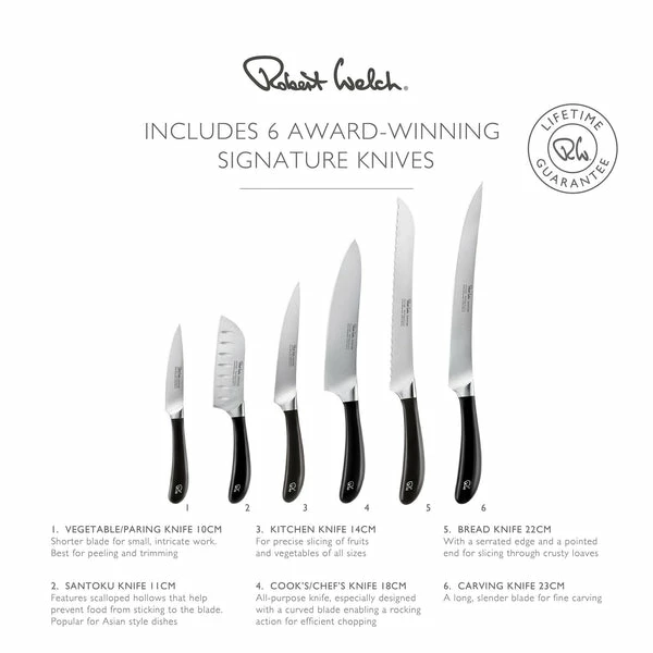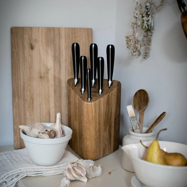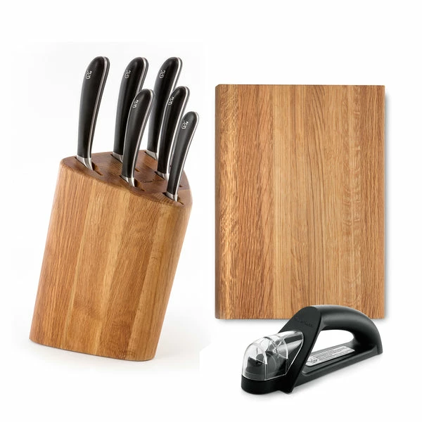 Crafted from solid oak, the prism oak knife block features a simple and functional design. The inbuilt slots allow maximum space around the knives, aiding access when in use whilst protecting knife blade edges. Includes six knives from the award-winning Signature knife range. Designed in consultation with professional chefs, these multi-award winning kitchen knives feature fully forged German DIN 1.4116 stainless steel blades with a full tang for extra strength. The Japanese-style blade edges are hand applied at a 15� angle. The handles are made from tactile DuPont and ergonomically shaped for comfort, balance and to minimise fatigue. Included in this set: Signature Carving Knife 23cm (1). Signature Bread Knife 22cm (1). Signature Cooks Knife 18cm (1). Signature Santoku Knife 11cm (1). Signature Kitchen Knife 14cm (1). Signature Vegetable / Paring Knife 10cm (1). Oak Classic Chopping Board 38cm (1). Signature Hand-Held Knife Sharpener (1). The Signature hand-held knife sharpener is also included in this set. Designed to maintain all plain-edge kitchen knives, this award-winning sharpener features an advanced ceramic wheel, a solid handle and weighted non-slip base. Use the knife sharpener regularly to quickly and easily hone your knife blades to the perfect edge. Please Note – you must be aged 18 or over to buy this product in the UK. Dimensions: Height: 236 mm. Height (inc Handles): 348 mm. Width: 160 mm.