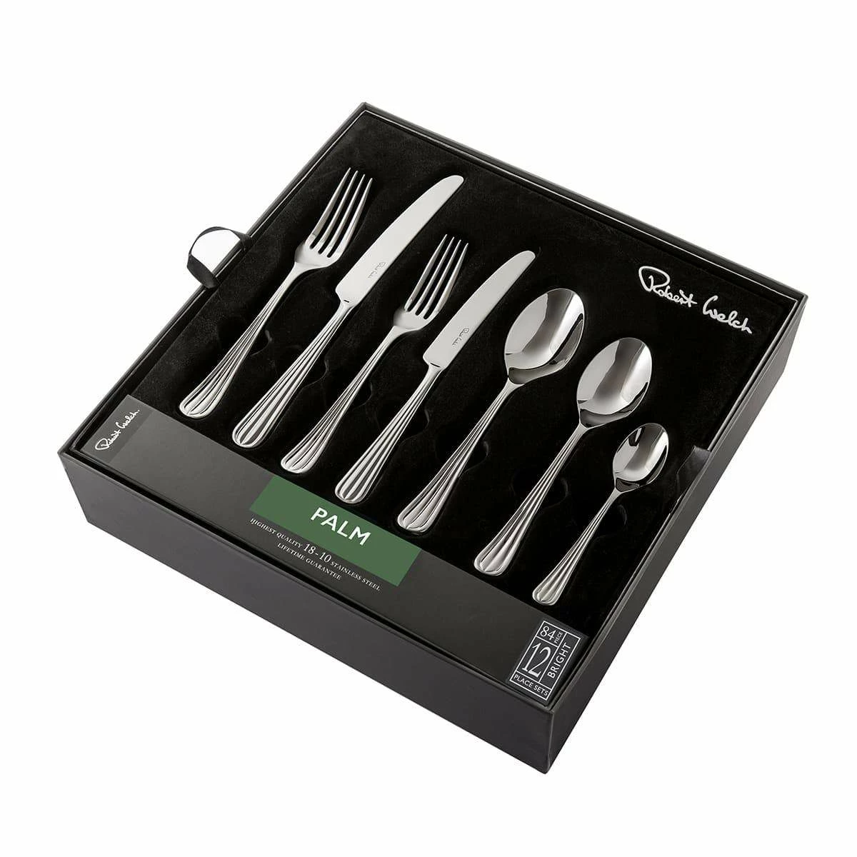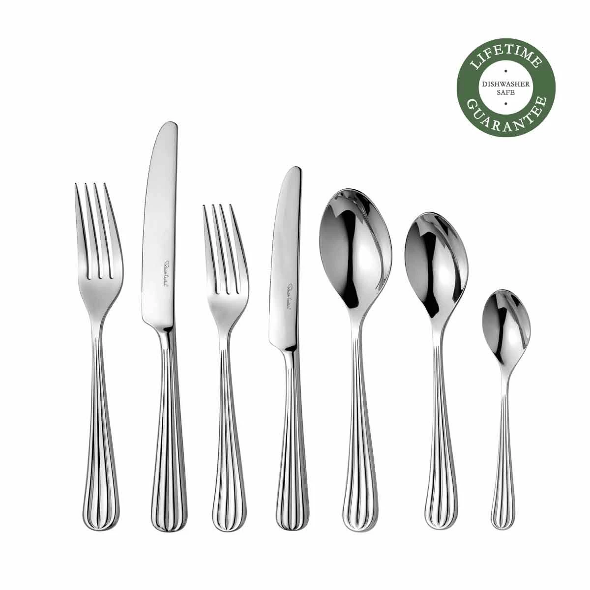 The long subtle flutes in the handles of Palm cutlery enhance the elegant profile of each piece. Spoons and forks are made using the highest quality 18/10 stainless steel. Knife blades are made from specially hardened stainless steel to provide the finest possible cutting edge. All Palm cutlery is available with a mirror finish, has a lifetime guarantee and is dishwasher safe. CONSISTS OF: Table Knife (12), Table Fork (12), Soup Spoon (12), Side Knife (12), Side Fork (12), Dessert Spoon (12), English Teaspoon (12)