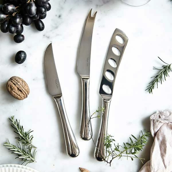 A set of three hollow handled cheese knives from the Radford cutlery range. Presented in an oak veneered box with grey velvet look interior. The oak pebble chopping board 32cm is made from solid oak wood and features a food safe oiled finish. This wooden board helps to protect your knife edges, all whilst providing an aesthetically pleasing display for your cheese. Please Note: This product is delivered in a oak presentation box. Consists of: Hard cheese knife (1), All-purpose cheese knife (1), Soft cheese knife (1), Oak box (1), Oak pebble chopping board 32cm (1).