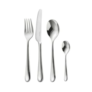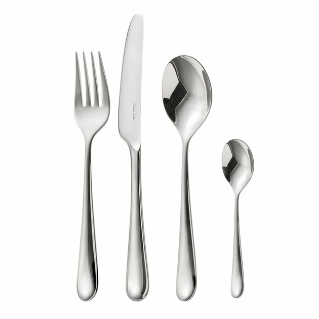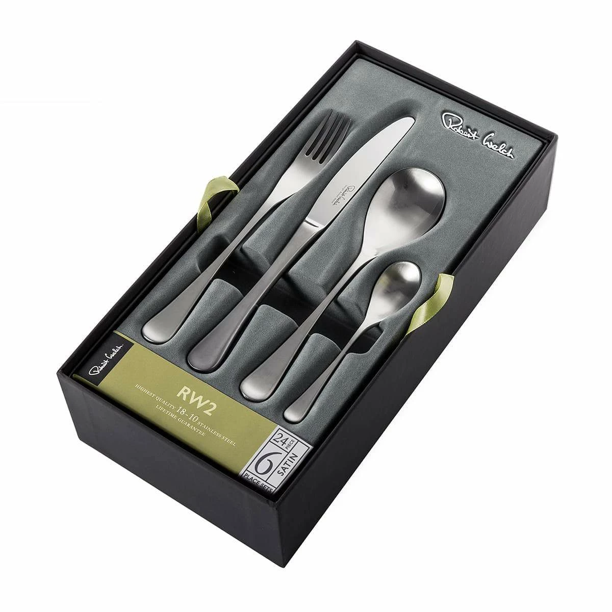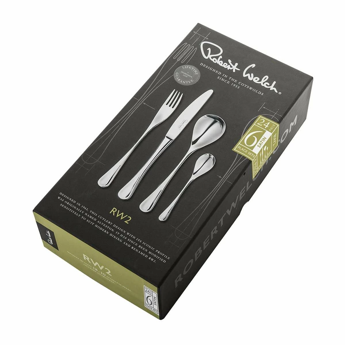 RW2 cutlery has soft concave detailing on each handle. The design is an updated version of Robert Welch’s Alveston cutlery, first released in 1962. Spoons and forks are made using the highest quality 18/10 stainless steel. Knife blades are made from specially hardened stainless steel to provide the finest possible cutting edge. This updated version of the award winning 1962 Alveston design is now available in commemorative packaging. RW2 is available with a mirror or brushed finish, has a lifetime guarantee and is dishwasher safe. CONSISTS OF: Table Knife (6), Table Fork (6), Soup Spoon (6), English Teaspoon (6)
