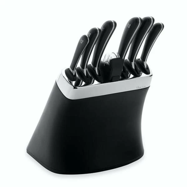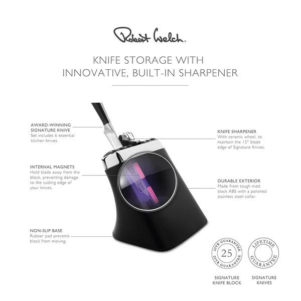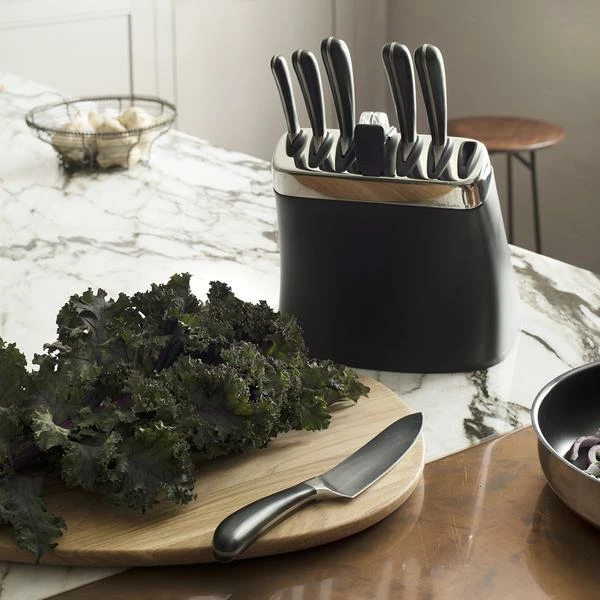 As beautiful as it is practical, the Signature knife block has been designed with effortless human interaction in mind. This block comes complete with an integrated ceramic wheel knife sharpener, to keep knives honed and sharp. A magnetic locator in each slot draws the spine of the knife to the block, preventing damage to the cutting edge when inserting or removing the knives. Made from durable matt black ABS with a polished stainless steel collar.
