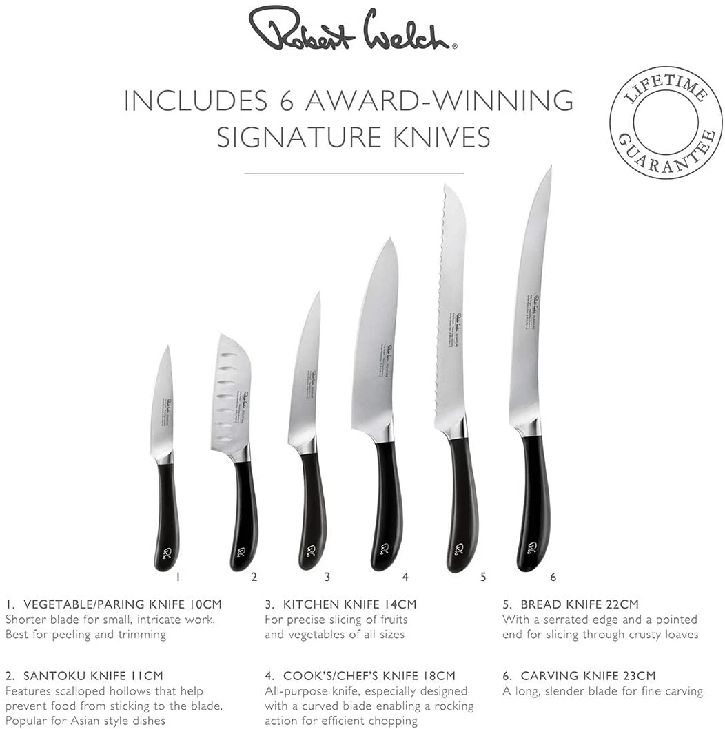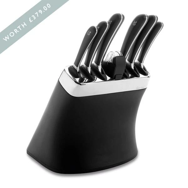 Signature Bread Knife 22cm (1), Signature Carving Knife 23cm (1), Signature Cooks Knife 14cm (1), Signature Kitchen Knife 14cm (1), Signature Serrated Utility Knife 12cm (1), Signature Vegetable/Paring Knife 8cm (1), Signature Knife Block with Sharpener (1)
