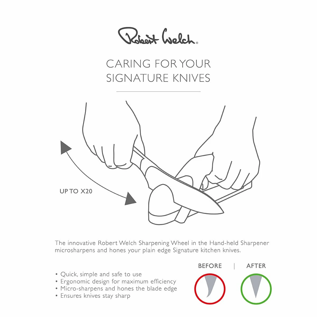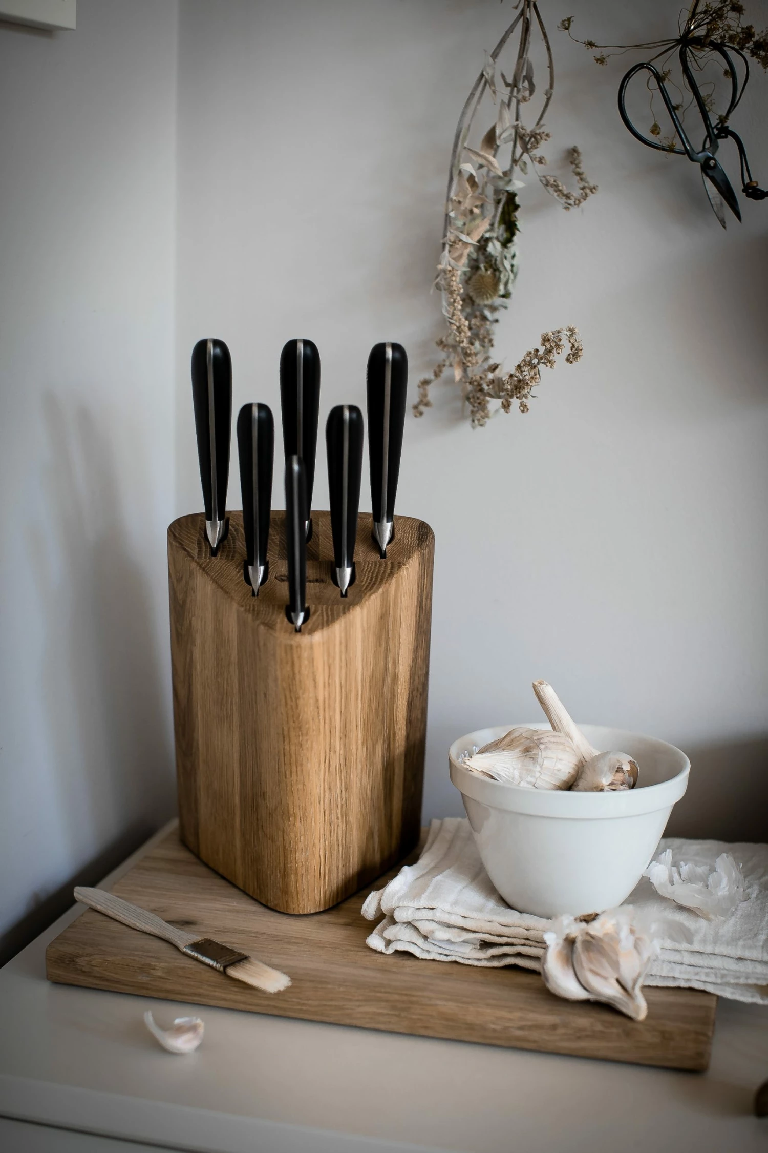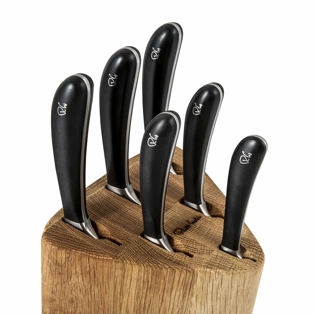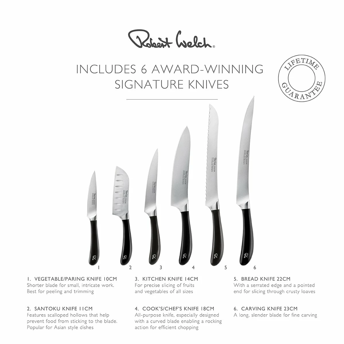 Crafted from solid oak, the Prism Oak Knife Block features a simple and functional design. The inbuilt slots allow maximum space around the knives, aiding access when in use whilst protecting knife blade edges. Includes six knives from the award-winning Signature knife range. Designed in consultation with professional chefs, these multi-award winning kitchen knives feature fully forged German DIN 1.4116 stainless steel blades with a full tang for extra strength. The Japanese-style blade edges are hand applied at a 15° angle. The handles are made from tactile DuPont™ and ergonomically shaped for comfort, balance and to minimise fatigue. SET CONSISTS OF: Signature Carving Knife 23cm (1), Signature Bread Knife 22cm (1), Signature Cooks Knife 18cm (1),Signature Santoku Knife 11cm (1), Signature Kitchen Knife 14cm (1), Signature Vegetable / Paring Knife 10cm PLEASE NOTE – you must be aged 18 or over to buy this product in the UK DIMENSIONS Height: 236 mm Height (inc Handles): 348 mm Width: 160 mm.