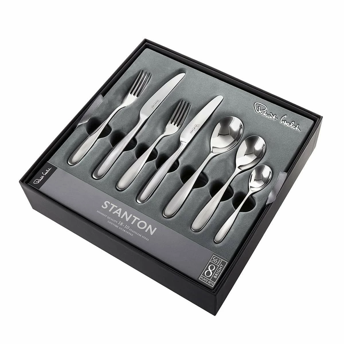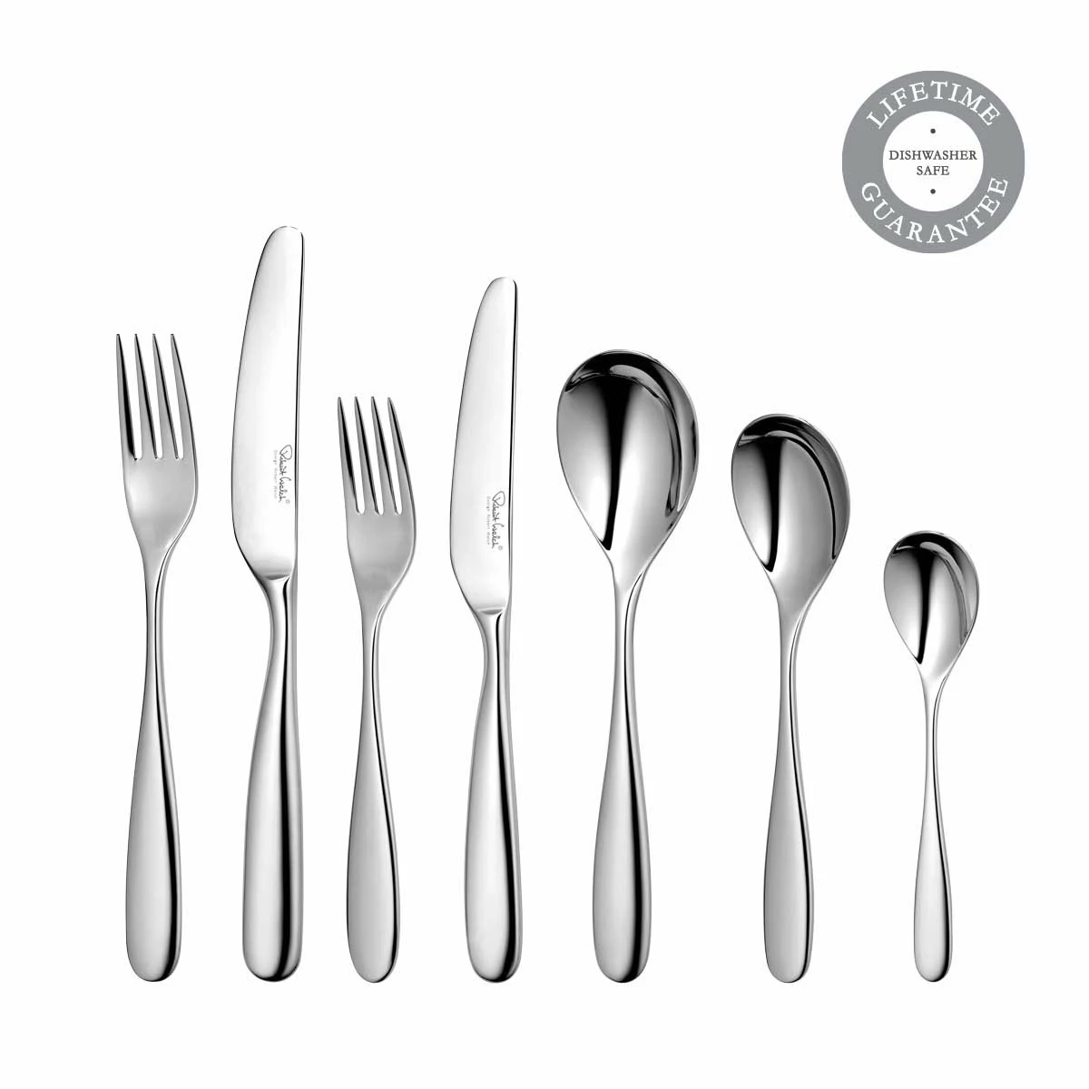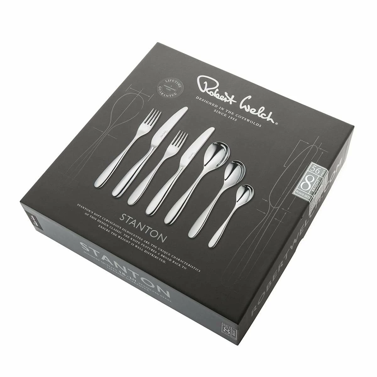 Stanton cutlery is an example of beautiful and exact sculpture; well-balanced and comfortable to use. Spoons and forks are made using the highest quality 18/10 stainless steel. Knife blades are made from specially hardened stainless steel to provide the finest possible cutting edge. All Stanton cutlery is available with a mirror or brushed finish, has a lifetime guarantee and is dishwasher safe. CONSISTS OF: Table Knife (8), Table Fork (8), Soup Spoon (8), Side Knife (8), Side Fork (8), Dessert Spoon (8), English Teaspoon (8)
