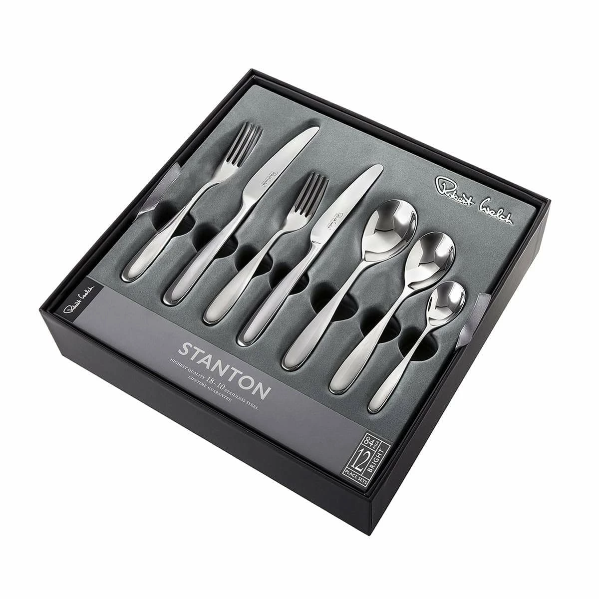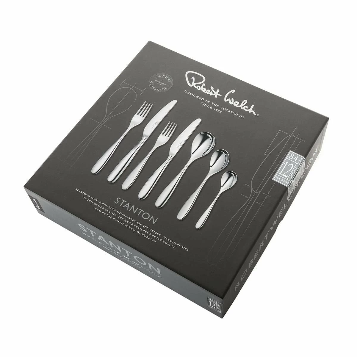 Stanton cutlery is an example of beautiful and exact sculpture; well-balanced and comfortable to use. Spoons and forks are made using the highest quality 18/10 stainless steel. Knife blades are made from specially hardened stainless steel to provide the finest possible cutting edge. All Stanton cutlery is available with a mirror or brushed finish, has a lifetime guarantee and is dishwasher safe. CONSISTS OF: Table Knife (12), Table Fork (12), Soup Spoon (12), Side Knife (12), Side Fork (12), Dessert Spoon (12), English Teaspoon (12)