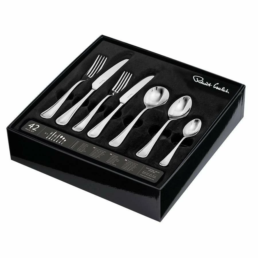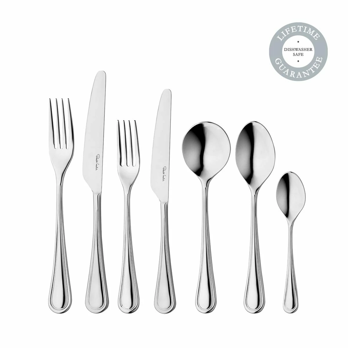 Stratford cutlery features a subtle beaded embellishment on the handle of each piece. Spoons and forks are made using the highest quality 18/10 stainless steel. Knife blades are made from specially hardened stainless steel to provide the finest possible cutting edge. All Stratford cutlery is available with a mirror finish, has a lifetime guarantee and is dishwasher safe. Please note: our Stratford cutlery range will be retired on 28th February, 2020. CONSISTS OF: Table Knife (6), Table Fork (6), Soup Spoon (6), Side Knife (6), Side Fork (6), Dessert Spoon (6), English Teaspoon (6)