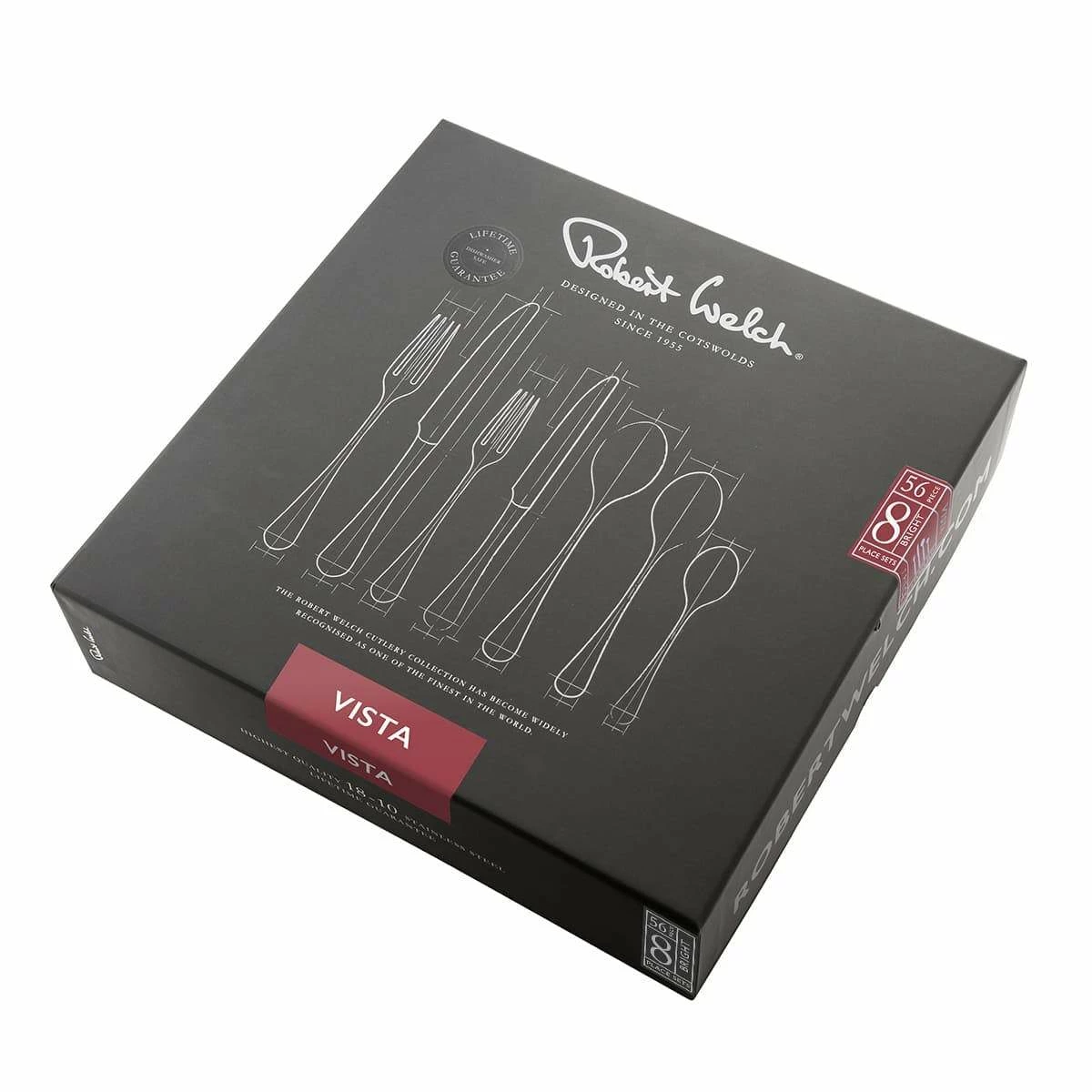 Vista cutlery’s vertical-standing knives and architectural appearance redefine the appearance of the traditional place setting. Spoons and forks are made using the highest quality 18/10 stainless steel. Knife blades are made from specially hardened stainless steel to provide the finest possible cutting edge. All Vista cutlery is available with a mirror finish, has a lifetime guarantee and is dishwasher safe. CONSISTS OF: Table Knife (8), Table Fork (8), Soup Spoon (8), Side Knife (8), Side Fork (8), Dessert Spoon (8), English Teaspoon (8)